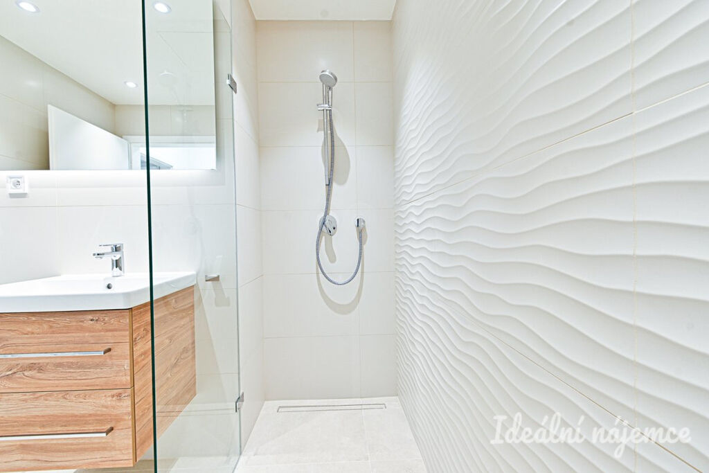 Stylová koupelna se pyšní elegantními velkoformátovými obklady v přírodních tónech, prostorným sprchovým koutem s černými designovými armaturami, závěsným WC a praktickou umyvadlovou skříňkou s úložným prostorem. LED podsvícení dodává koupelně moderní atmosféru.