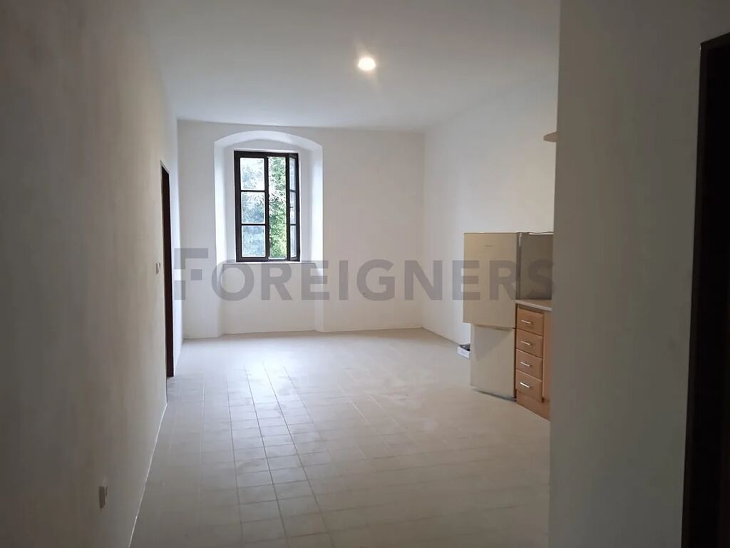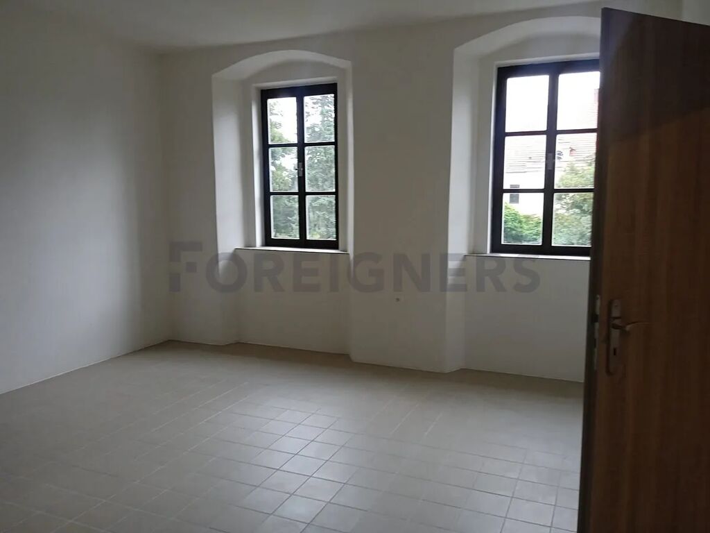 Okna bytu jsou orientována na jihovýchod, což zajišťuje dostatek denního světla, a navíc nabízejí krásný výhled do zeleně. Velmi estetickým prvkem jsou původní oblouková okna, která byly citlivě zachována a dodávají prostoru jedinečný charakter.