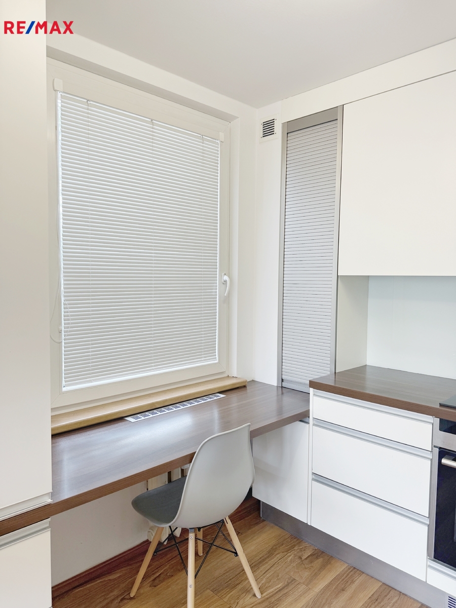 Moderní kuchyň je plně vybavená všemi spotřebiči včetně myčky, trouby, varné desky a lednice. Součástí kuchyně je i praktický pracovní kout u okna.