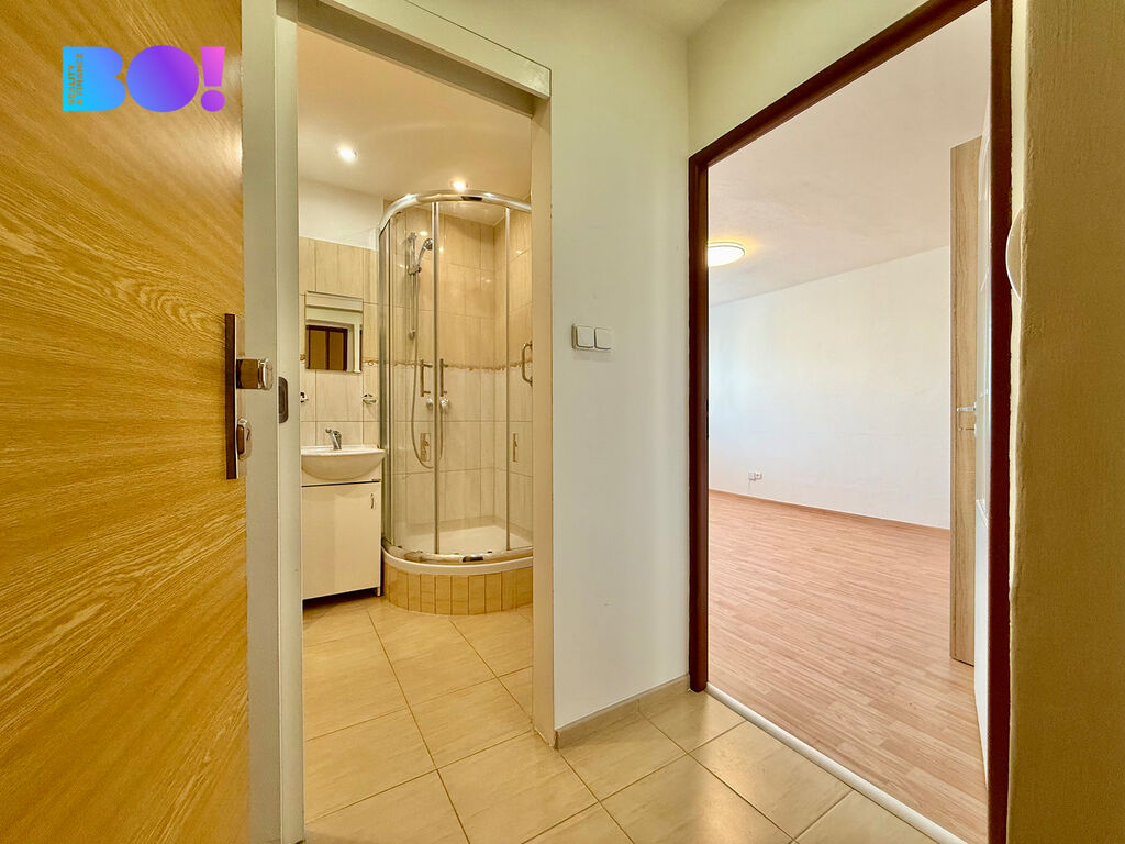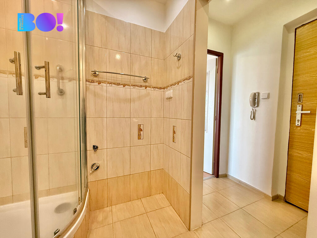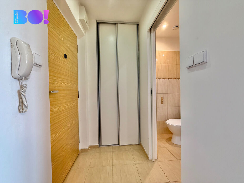 Interiér bytu je částečně zařízen a disponuje vstupní chodbou, kde je umístěna vestavná skříň na boty. Kuchyň je vybavena elektrickou troubou a dvěma plynovými hořáky. Prostor v koupelně nabízí sprchový kout a WC, včetně místa pro pračku. Pokoj je prostorný a obsahuje velkou skříň, což umožňuje dostatek úložného prostoru.