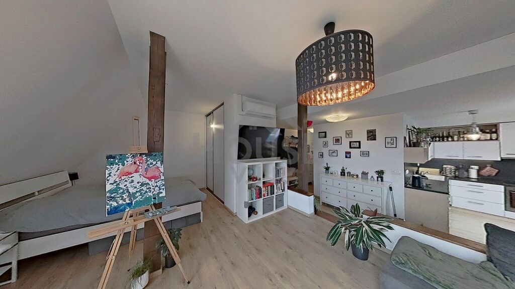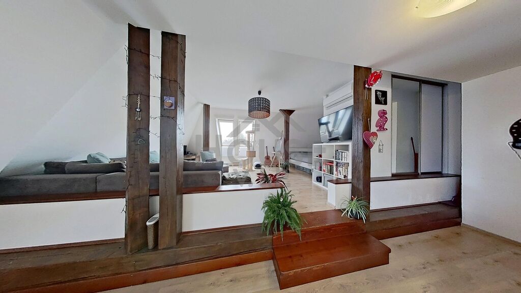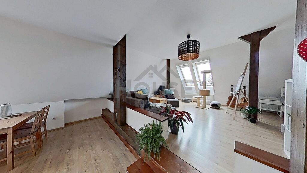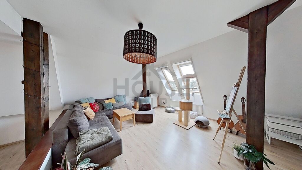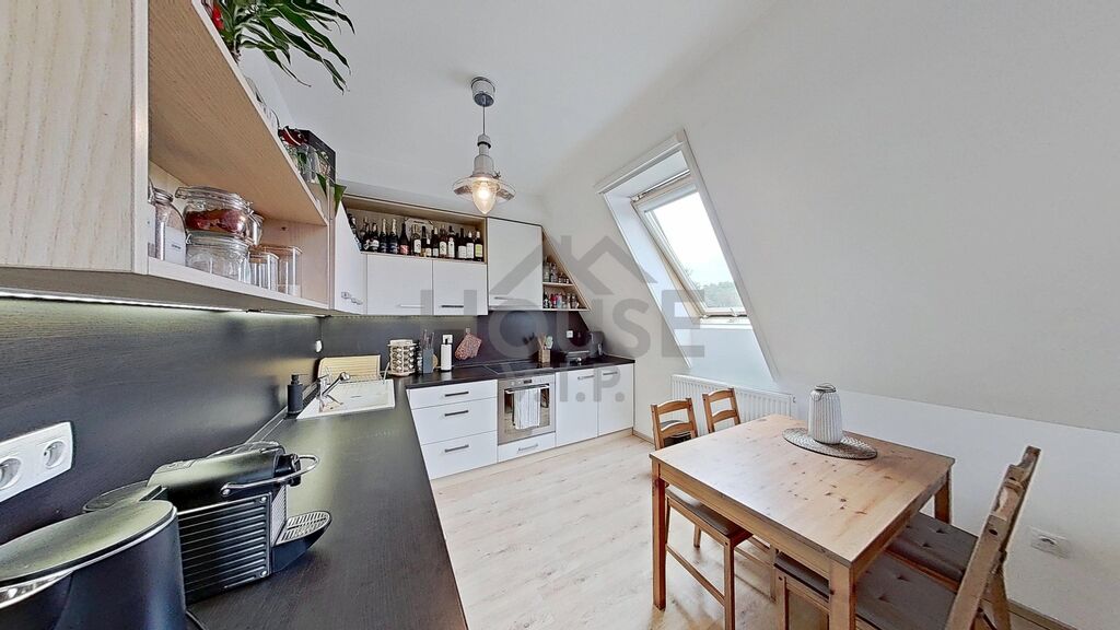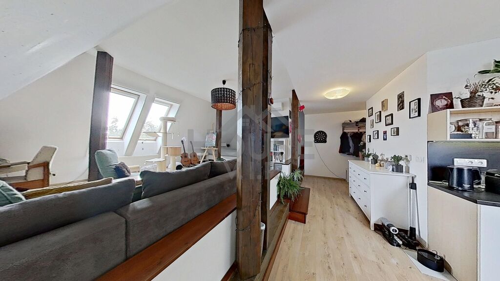 Nabízím vám krásný podkrovní byt 2+kk o velikosti 62,5 m², který se nachází v cihlovém domě ve třetím patře. Byt je světlý, vzdušný a útulný – působí opravdu příjemně a hned vás pohltí otevřený prostor, který si majitelka přála zachovat. Pokud budete chtít, můžete si ho ale snadno rozdělit a vytvořit tak samostatný obývací pokoj s ložnicí.