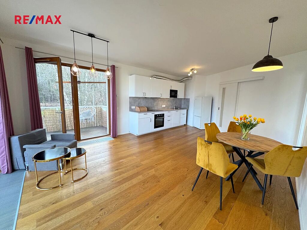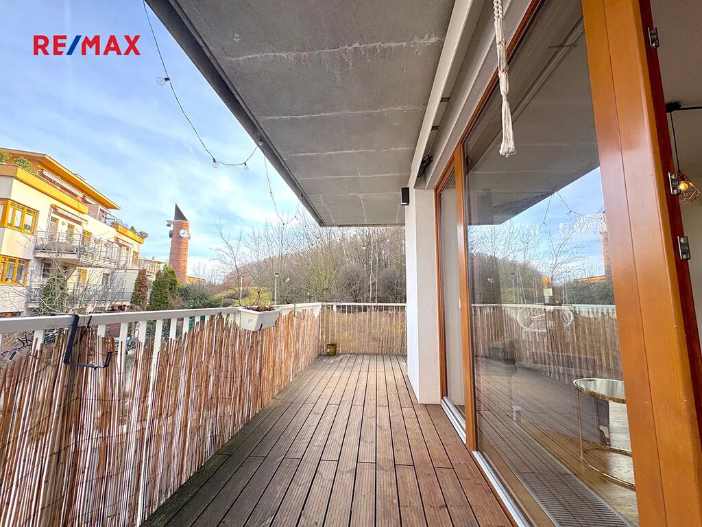 Byt je prostorný, světlý a nadčasově řešený. Hlavní obytný prostor s kuchyňským koutem má 30 m² a je vybaven kompletně zařízenou kuchyňskou linkou. Obývací pokoj má velká francouzská okna se vstupem na terasu. Rozlehlá terasa (15,9 m²) je orientovaná na východ, je zde dostatek denního světla a příjemné posezení po celý den.