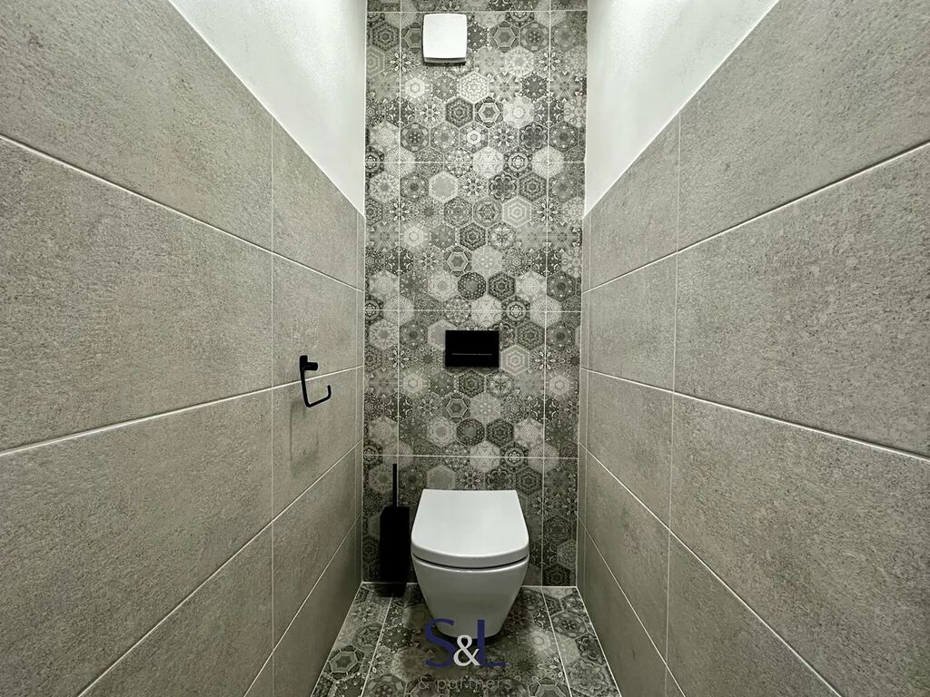 Koupelna se sprchovým koutem i samostatné WC s podlahovým topením, připojení na pračku a sušičku elegantně vyřešeno v chodbě do výklenku. Vchodové bezpečností dveře s akustickou vložkou, plastová okna se žaluziemi.