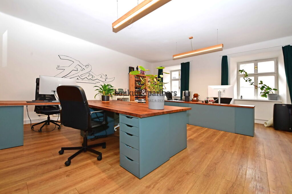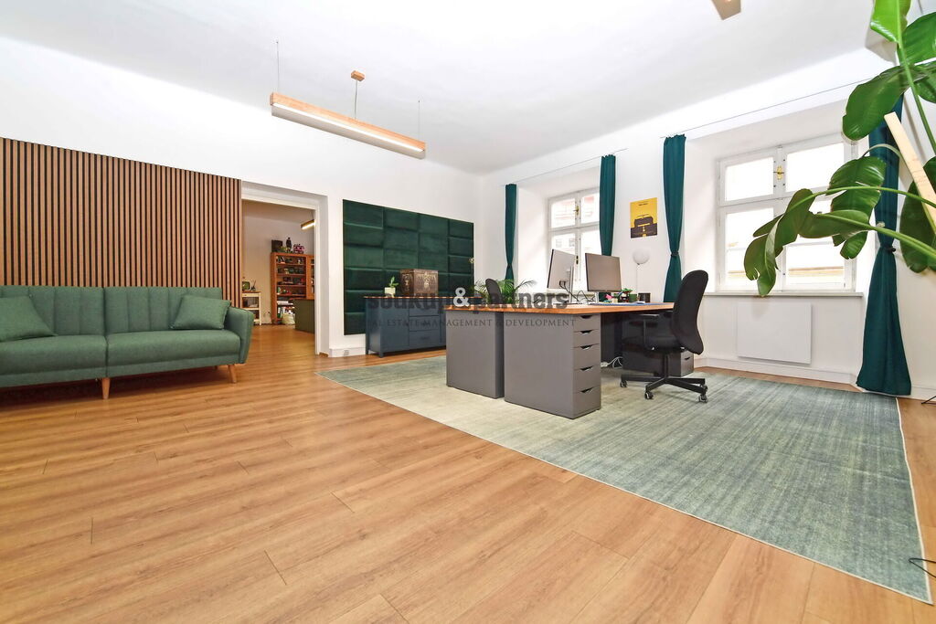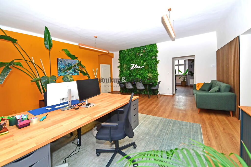 Kanceláře s příslušenstvím - 205 m2, nacházející se ve 3.podlaží historického domu v Praze 1 - Malá Strana. Jedná se o pronájem celého patra. Vhodné na kancelářský provoz, školící centrum, školu, advokátní kancelář apod. Dispozičně je prostor rozdělen na vstupní foyer s recepcí, dále 4 samostatné prostorné kanceláře, místnost s kuchyňským koutem, 2 x toaleta, 1 x sprcha, komora a oddělený prostor se vstupem přes pavlač, kde se nachází další kancelář. Prostory lze však rozdělit na více menších kanceláří. Telefon, internet, počítačová síť - rozvedeno po místnostech. Vybaveno zabezpečovacím systémem. Na podlahách je vinyl v kombinaci s plovoucí podlahou a dlažbou. Po dohodě se současným nájemníkem, lze zanechat vybavení. Volné ihned 1.1. 2026. Nájemné 65.000,-Kč, služby jsou pouze zálohy na vodu, elektřina se převádí na nájemníka, kauce 65.000,-Kč, provize pro RK 65.000,-Kč + dph. Pro více informací volejte manažera nabídky.