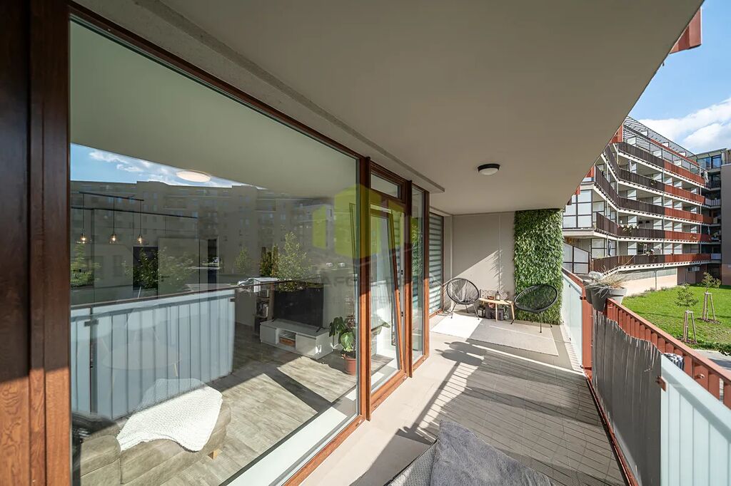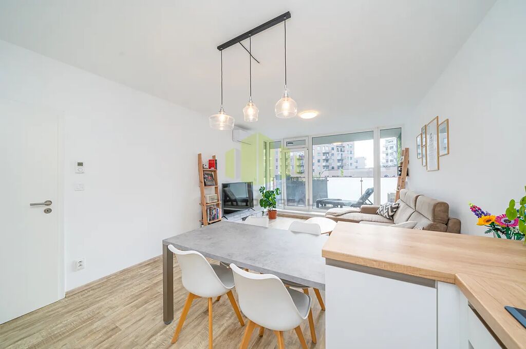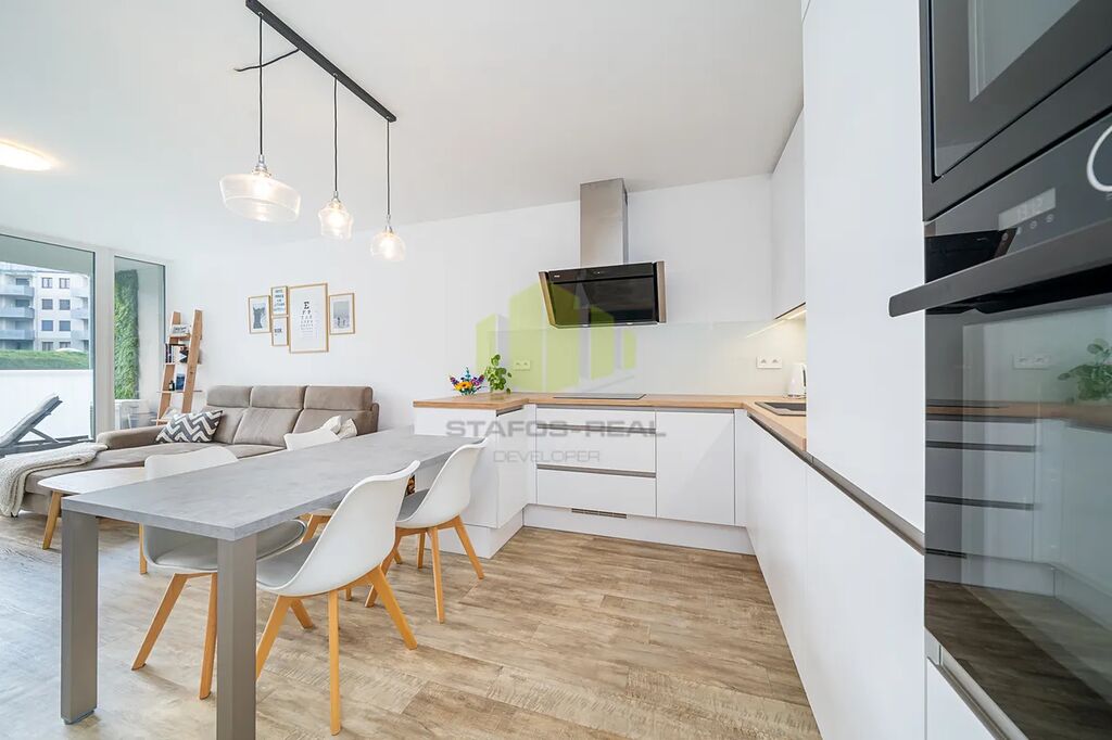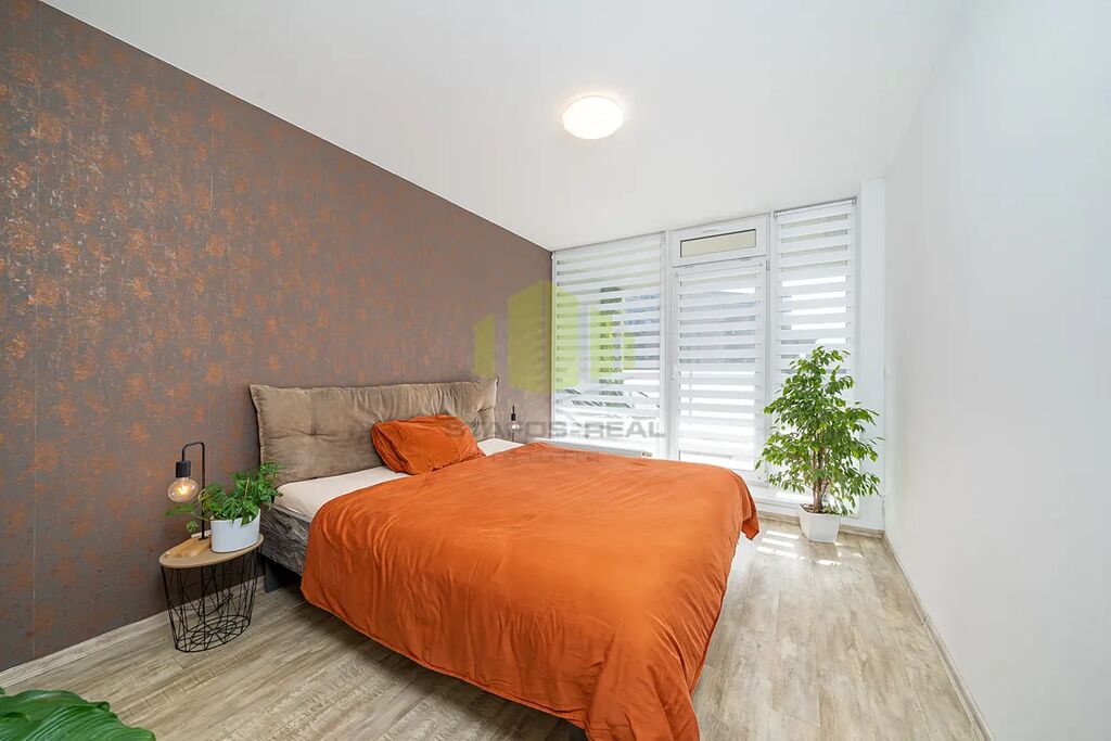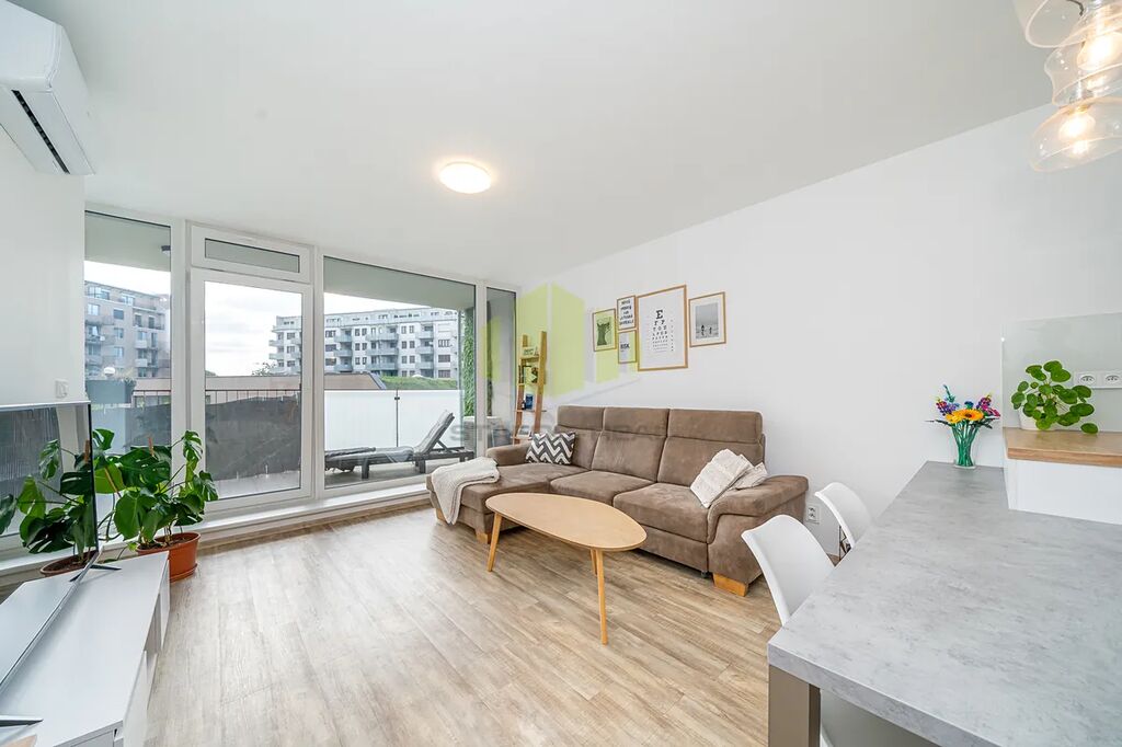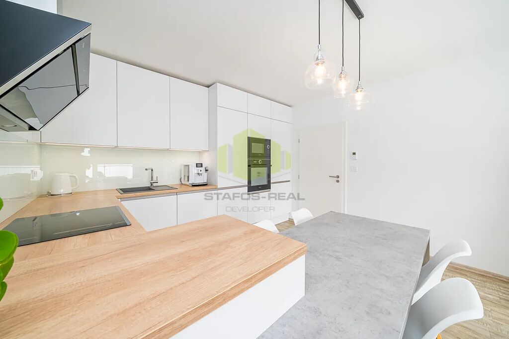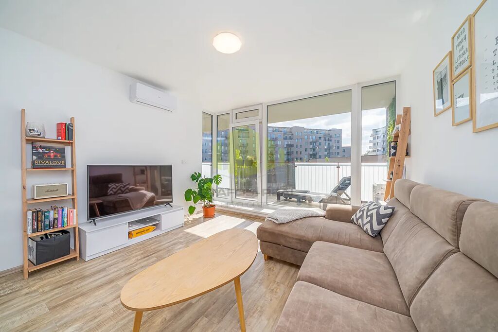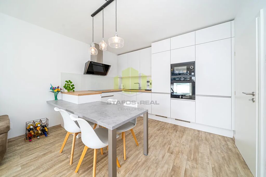 Byt se prodává kompletně vybavený moderním nábytkem, doplňky i kuchyňskou linkou se spotřebiči. Stačí se jen nastěhovat.
