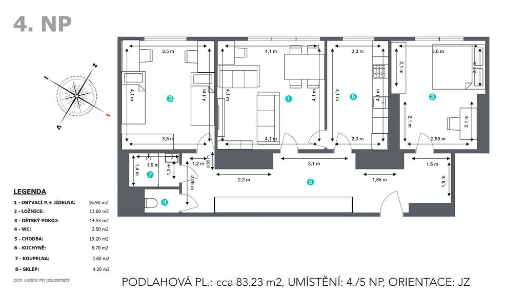 obývací pokoj + jídelna: cca 16,9 m² – nabízí se varianta propojení s kuchyní;