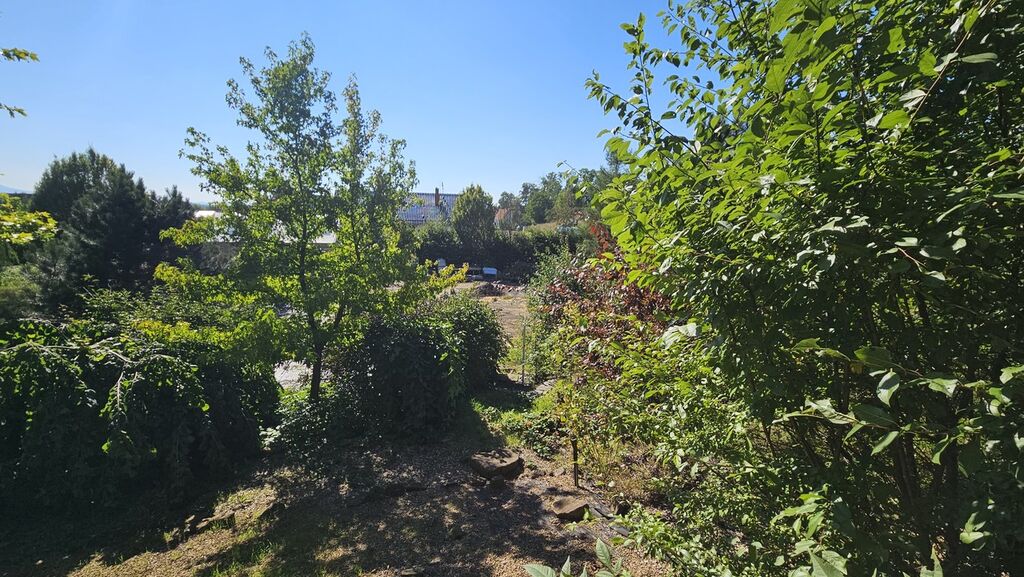 Pozemek je oplocený ze tří stran, se vzrostlou zelení kolem celého pozemku.