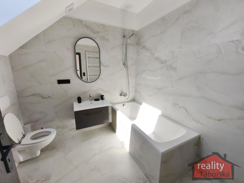 V obývacím pokoji s kuchyňským koutem a ložnici je laminátová plovoucí podlaha, v koupelně a na chodbě keramická dlažba. V koupelně je vana, umyvadlo, toaleta a prostor na pračku s připravenými vývody na vodu a odpad. Provedení ve standardu, není potřeba dokončovacích prací. V bytě jsou dřevěná střešní okna a bezpečnostní vstupní dveře, které jsou uvnitř foliované. Vchodové dveře do domu mají bezpečnostní zámek ovladatelný z mobilního telefonu.