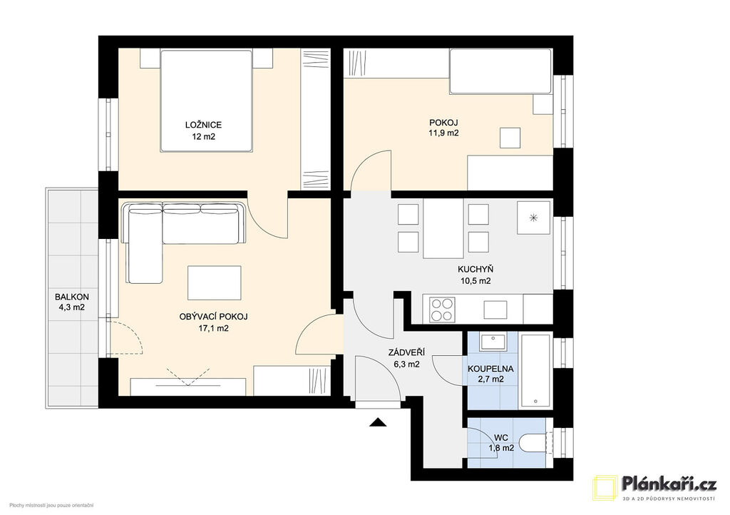 Fotografie obsahují vizualizace možného vybavení pro Vaši lepší představu o zařízení bytu. Pro lepší představu přikládáme i 2D a 3D půdorysy bytu.