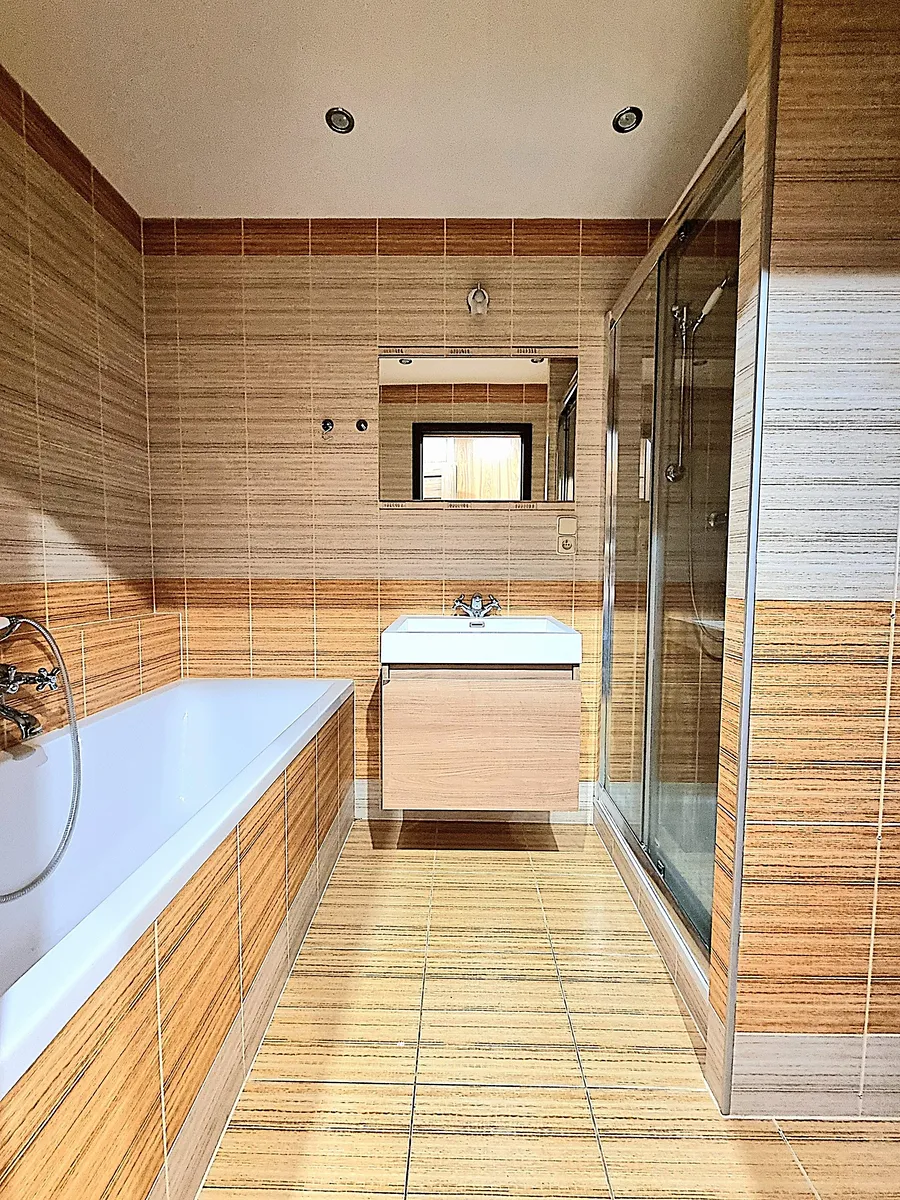 Koupelna je vybavena vanou i prostorným sprchovým koutem, což potěší každého, kdo si rád dopřeje komfort a relaxaci po náročném dni.