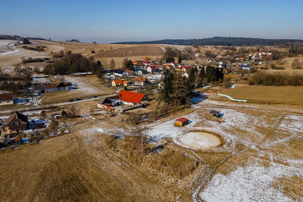 • Nově vybudovaný seník, jezírko a několik vzrostlých ovocných stromů.