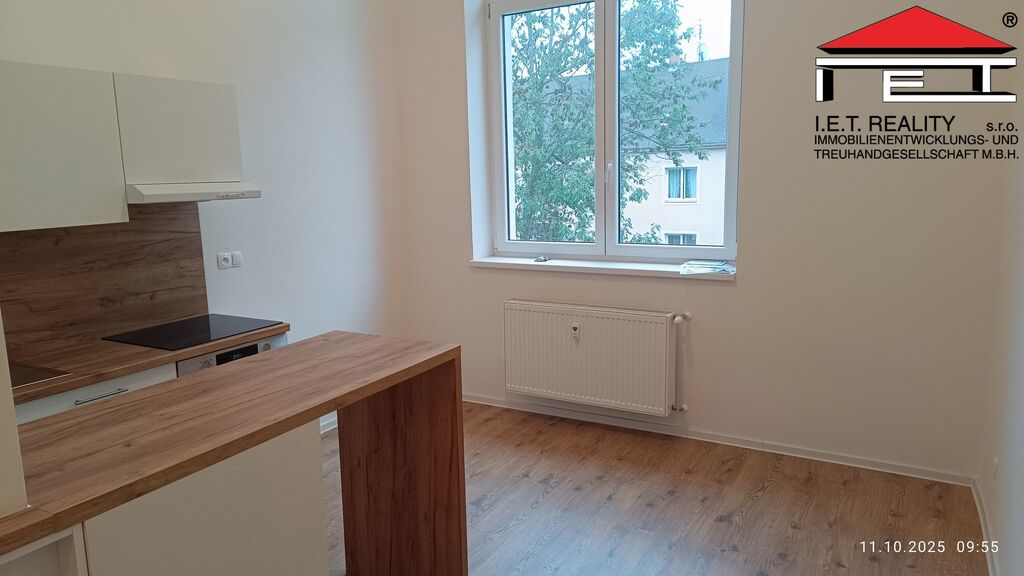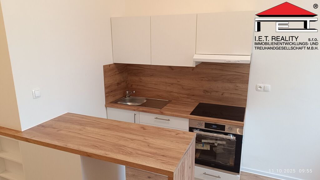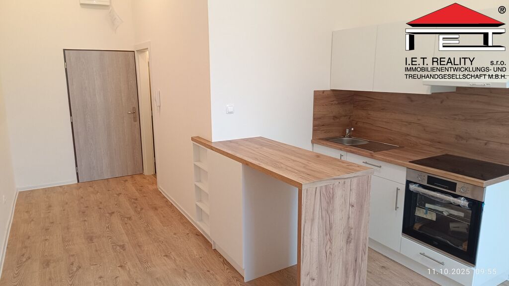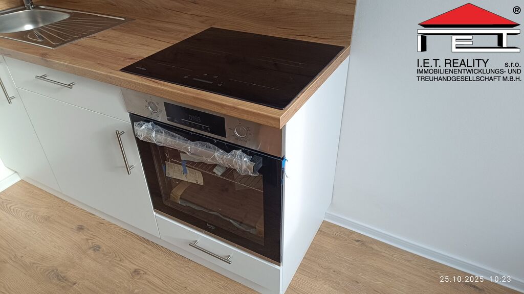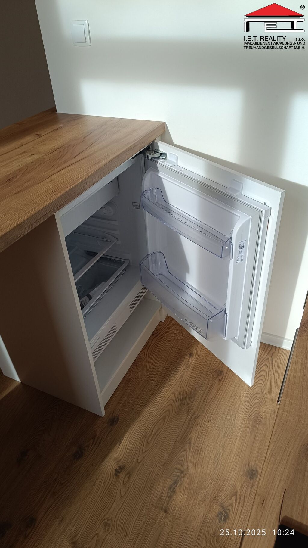 V bytě je moderní kuchyňská linka s el. varnou deskou, troubou a lednicí.