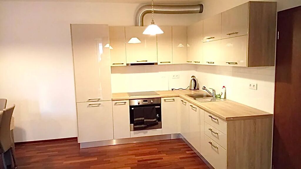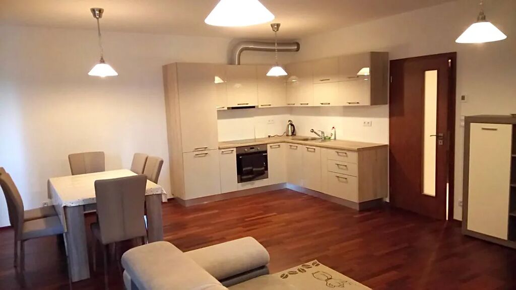 Byt je zařízený. Kuchyň je vybavená kuchyňskou linkou a elektrospotřebiči.