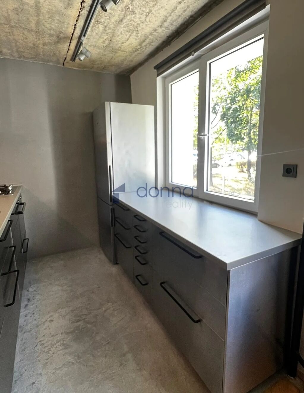 Moderní industriální design s odkrytými stropy, betonovými stěrkami a dřevěnou podlahou.