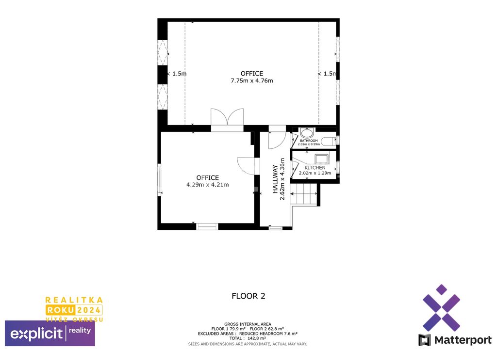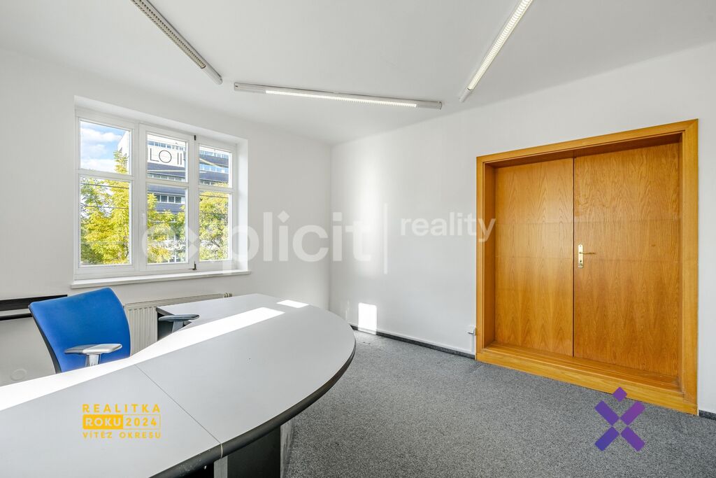 První patro nabízí kancelář a další velkou místnost, kterou můžete využít jako další kanceláře nebo školící prostory. Najdete zde také další kuchyňku a toaletu, což zajišťuje pohodlné zázemí pro administrativu, schůzky či školení.