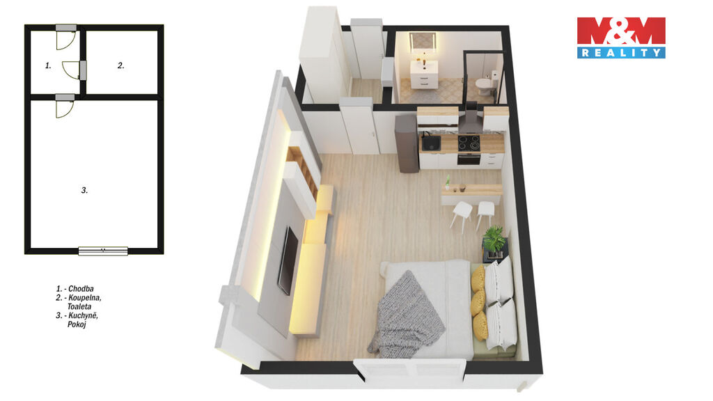 Nabízíme ke koupi byt v osobním vlastnictví, o dispozici 1+kk a podlahové ploše 18 m², umístěný v 1. patře domu, který prošel kompletním zateplením a instalací nových plastových oken. K bytu náleží sklepní kóje a podíl na společných prostorách domu a pozemku. Vytápění i ohřev vody jsou zajištěny dálkově z teplárny, byt má zděné jádro. Dispozici tvoří vstupní chodba s praktickými úložnými prostory, koupelna se sprchovým koutem a WC, obývací pokoj s kuchyňským koutem orientovaný na severovýchod. Nízké náklady na bydlení. Skvělá dopravní dostupnost – zastávka MHD přímo u domu, vlaková stanice 400 m – a kompletní občanská vybavenost v okolí dělají z této nabídky ideální volbu pro vlastní bydlení i investici.