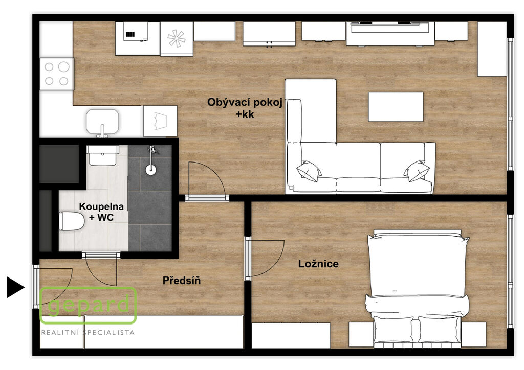 Bytová jednotka je po kompletní rekonstrukci a je kompletně vybavená. Je zde předsíň, koupelna se sprchovým koutem a WC, ložnice a obývací pokoj s vybavenou kuchyňskou linkou. Součástí vybavení kuchyňské linky je varná deska, digestoř, horkovzdušná elektrická trouba, myčka a lednice s mrazákem. K dispozici je sklep.