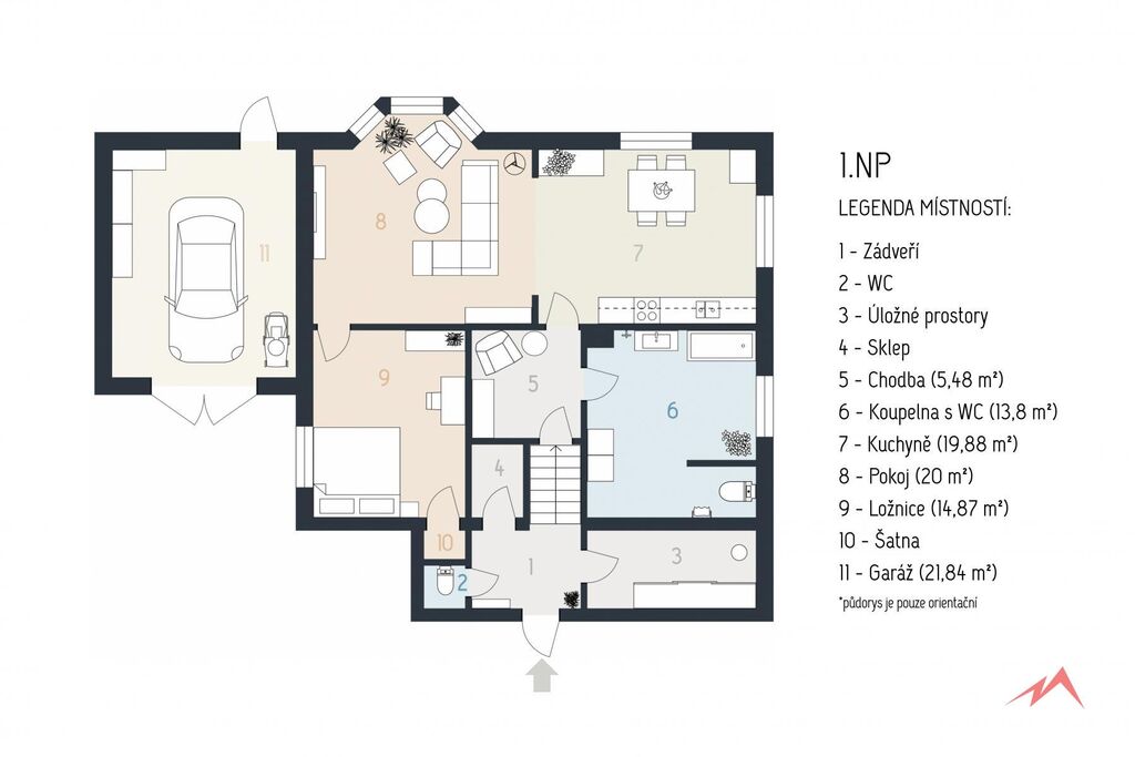Dům nabízí ideální kombinaci pohodlného bydlení pro dvě generace s možností rozšíření o podkrovní byt.