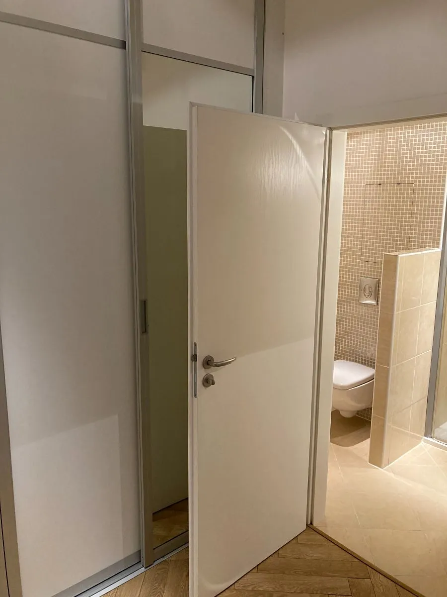 v chodbě ve vestavné skříni. Ve všech místnostech je na podlaze plovoucí