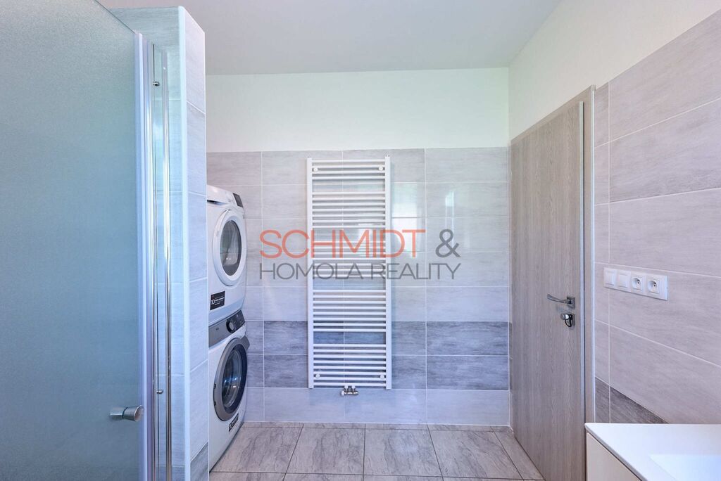 Dispozice uspokojí i větší rodinu. V přízemí najdeme prostorný obývací pokoj s kuchyňským koutem a vstupem na terasu, ložnici, koupelnu se sprchovým koutem, oddělené wc, zádveří při vstupu z ulice i do zahrady. V první podlaží potom tři samostatné neprůchozí pokoje, šatnu, oddělené wc a koupelnu s vanou.