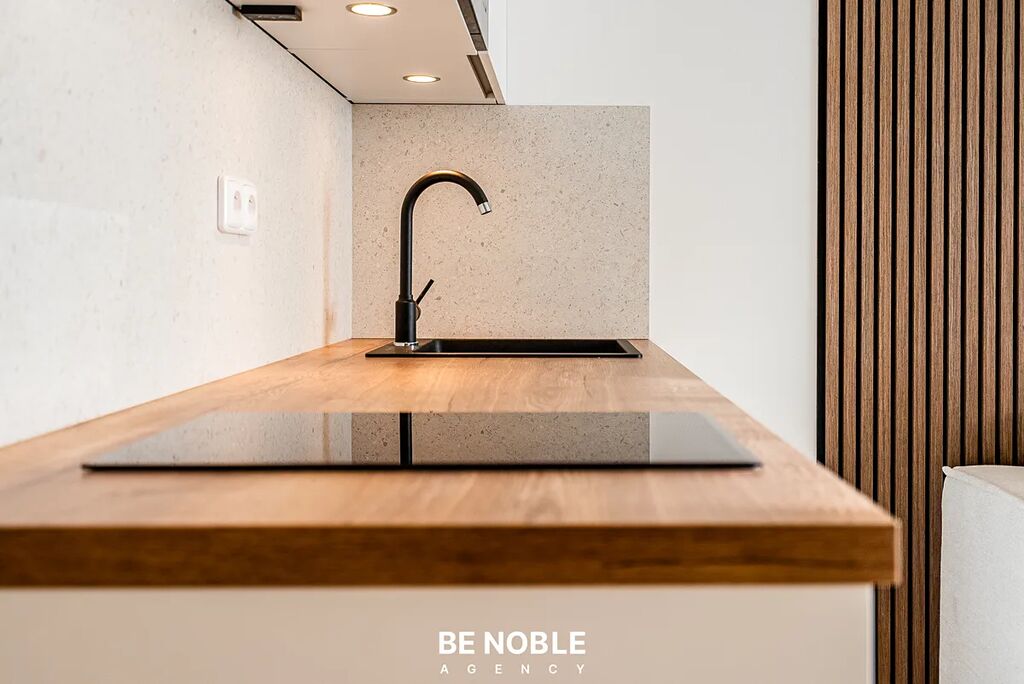 Byt je plně vybavený a připravený k okamžitému nastěhování. Součástí je moderní vestavěná kuchyňská linka s dostatkem úložných prostor, varnou deskou, lednicí, vestavěnou digestoří a mikrovlnnou troubou. Obytná část je zařízena kvalitní rozkládací pohovkou, komodou a jídelním stolem pro dvě osoby. Závěsy, záclony a designová svítidla dotvářejí příjemnou atmosféru. V předsíni před předáním proběhne instalace úložných prostor. Velké okno, kterým proudí spousta světla, a výhled do klidného zeleného vnitrobloku z 5. patra. Koupelna se sprchovým koutem, záchodem, pračkou a umyvadlem. Pod umyvadlem je úložný prostor.