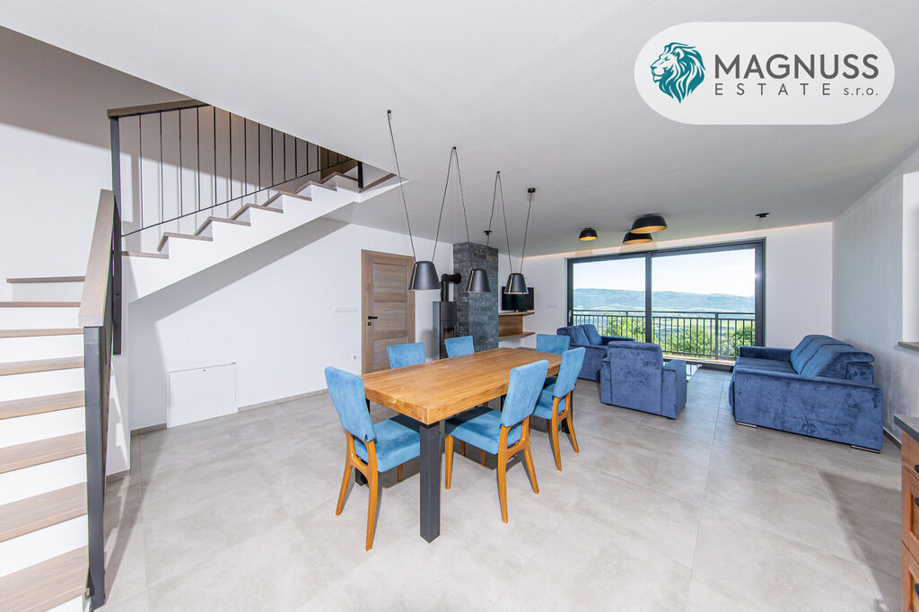Ve druhém nadzemním podlaží se vstupuje do společné chodby, z níž vedou samostatné vstupy do dvou identických apartmánů. Každý z nich má vlastní měření energií a je plně vybaven a připraven k okamžitému užívání. Hlavní prostor tvoří obývací pokoj s kuchyňským koutem a jídelní částí, ze kterého je přímý vstup na terasu. Ta je orientovaná na východ a nabízí ničím nerušený výhled do otevřené krajiny.