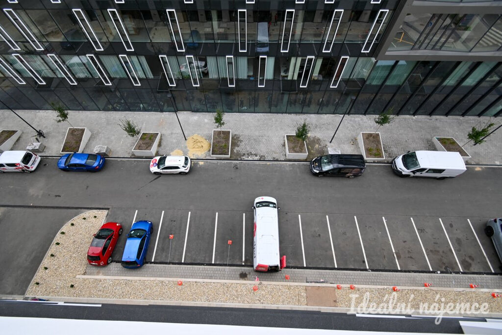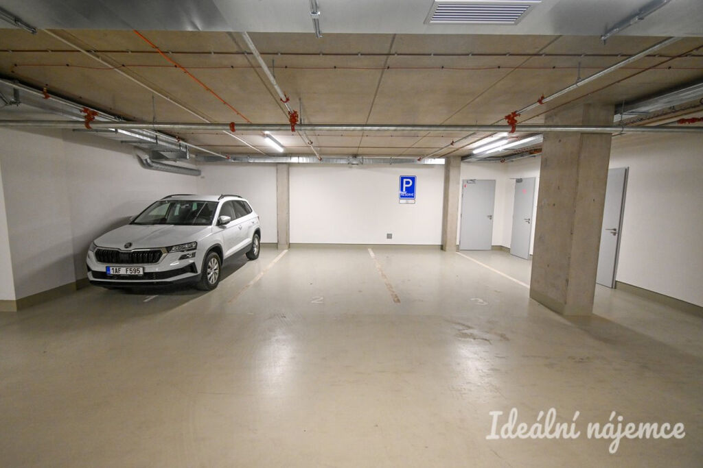 K bytu je možné pronajmout garážové stání za 3 000 Kč měsíčně. Stání je vybaveno elektrickou přípojkou, kterou lze využít pro nabíjení elektromobilu.