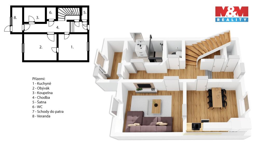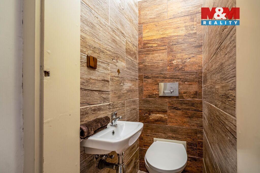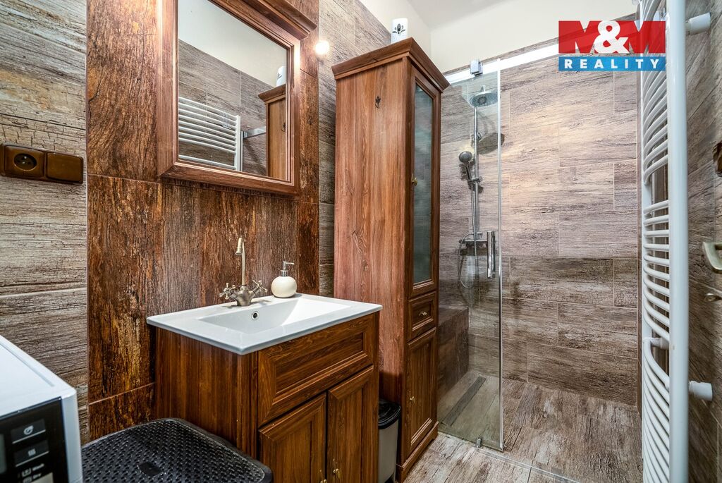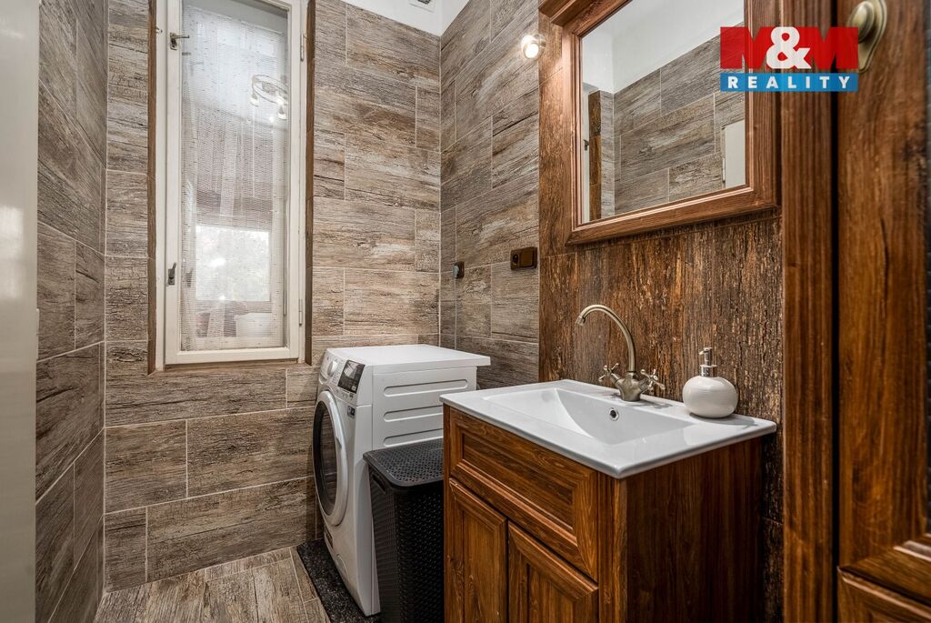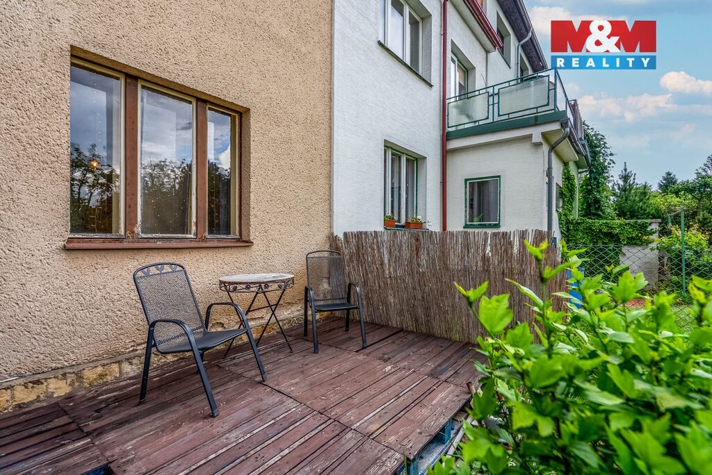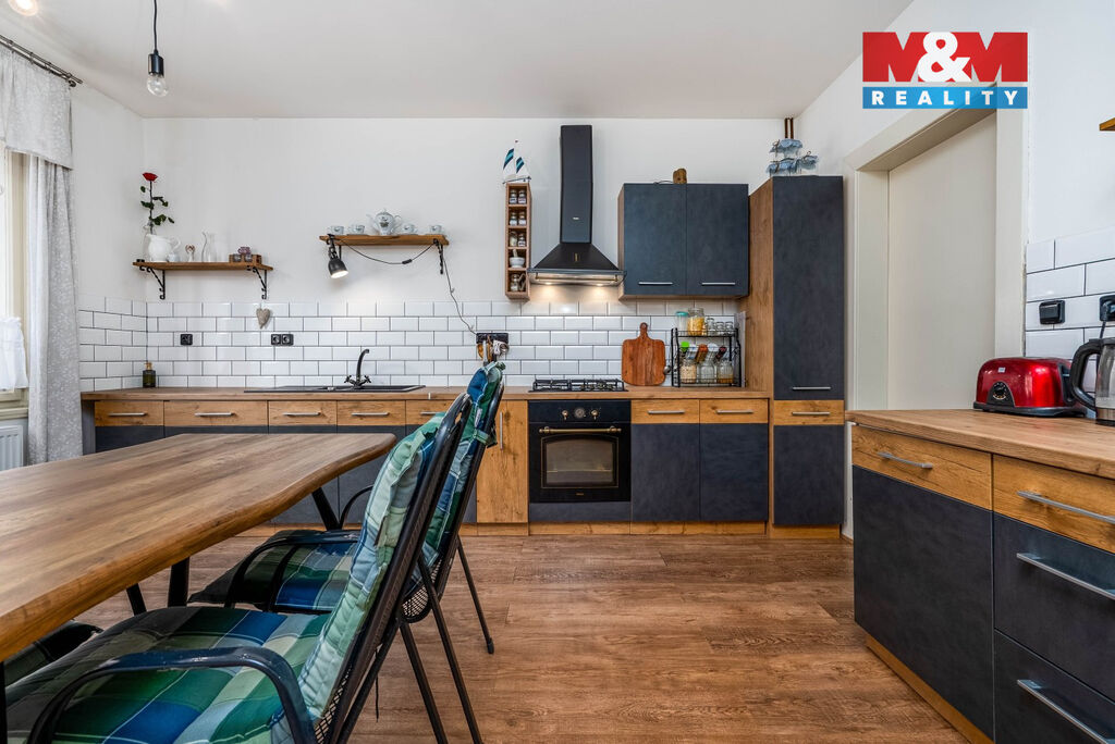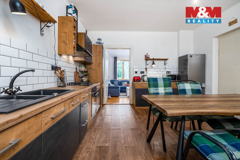 Přízemí tvoří velká kuchyně, která přechází do slunného obývacího pokoje s oknem do zahrady. Koupelna po moderní rekonstrukci zaujme prostorným sprchovým koutem s pohodlnou nikou pro sezení, samostatné WC je laděno do stejného stylu.