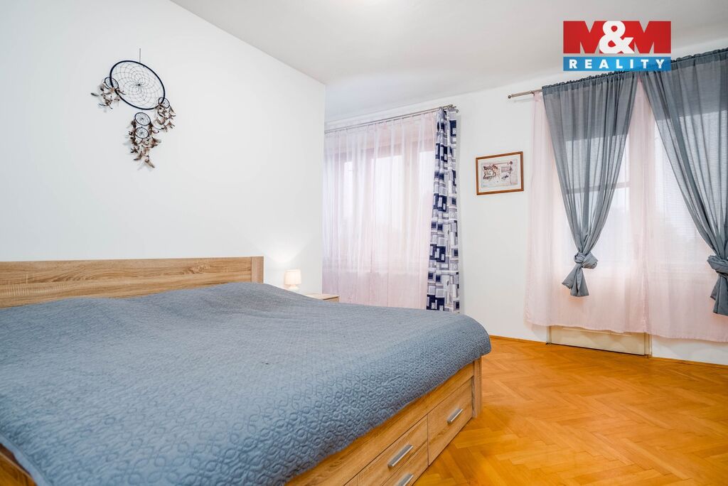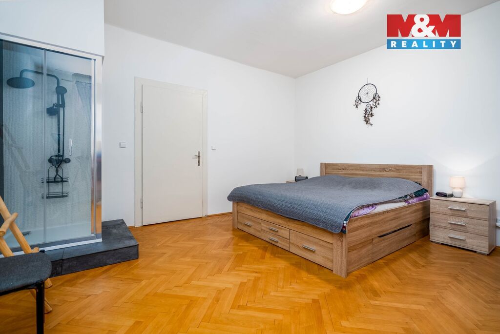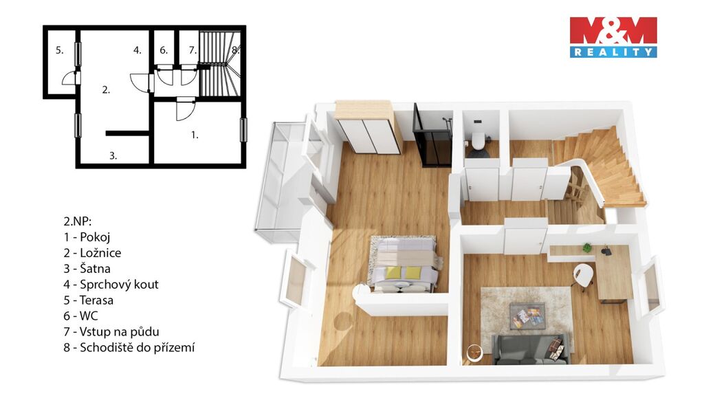 V patře se nachází ložnice se šatnou, přístupem na terasu, výhledem do zahrady a sprchovým koutem přímo v místnosti. Druhý pokoj směřuje do ulice. I zde je samostatná toaleta.