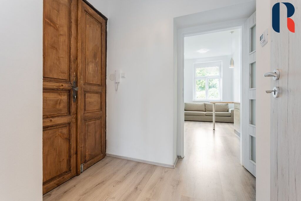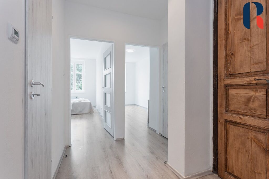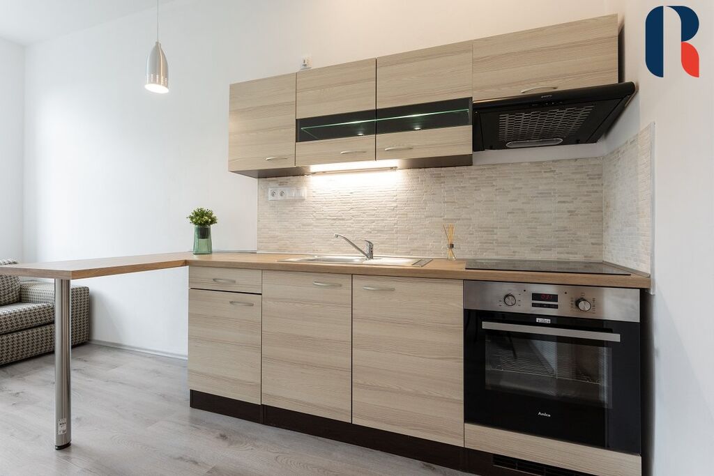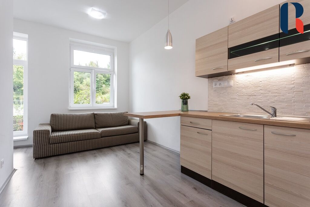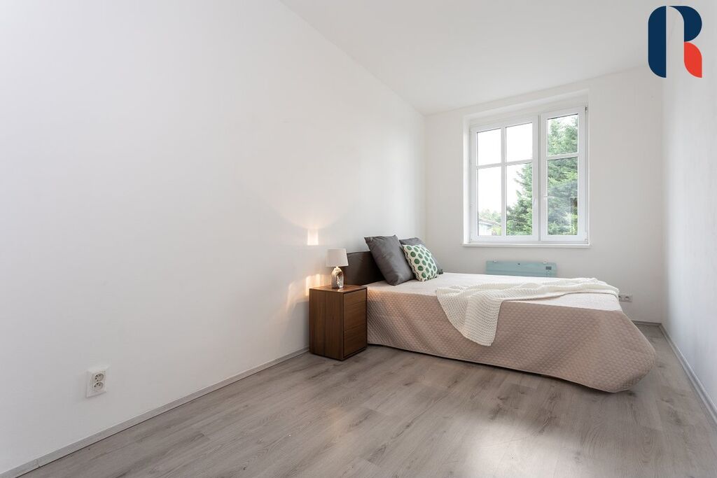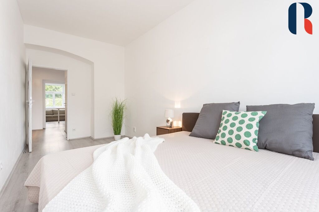 Byt je po kompletní rekonstrukci s novou dlažbou, plovoucí podlahou a novými prosklenými dveřmi. V bytě jsou nové skleněné konvektory s digitálním termostatem, nové rozvody elektřiny, vody a odpadu. Byt je vybaven TV, SAT a internetovou přípojkou. Byt se skládá ze vstupní chodby, pokoje s kuchyňským koutem, ložnicí, koupelnou s obkladem z mozaiky, se sprchovým koutem s podomítkovou baterií, se skleněnou zástěnou a samostatným WC s geberitem. Je vybaven moderní kuchyňskou linkou s obkladem z kamene, se spotřebiči (sklokeramická varná deska, horkovzdušná trouba, digestoř) a barevnými luxfery. Byt je vzdušný, světlý a elegantní. Výhled do zahrady.