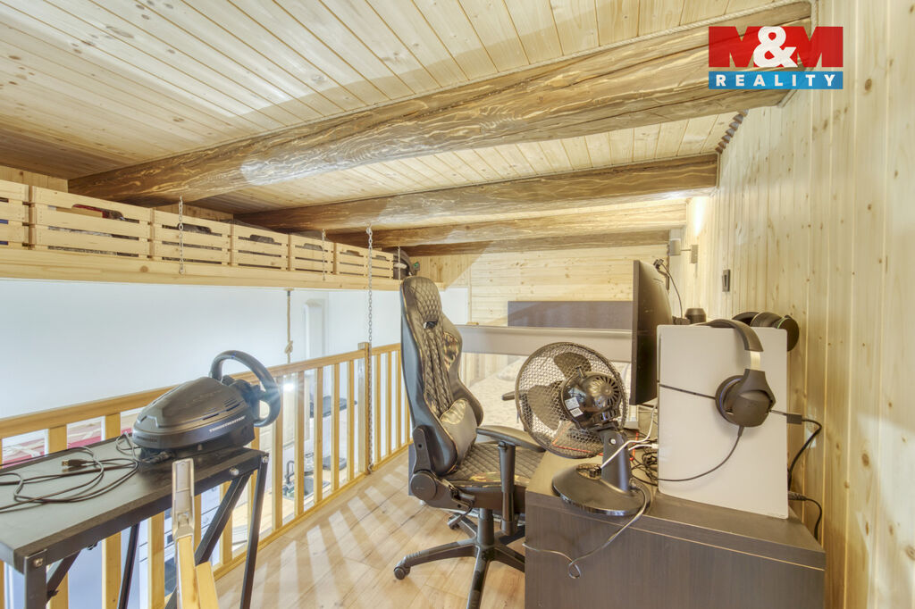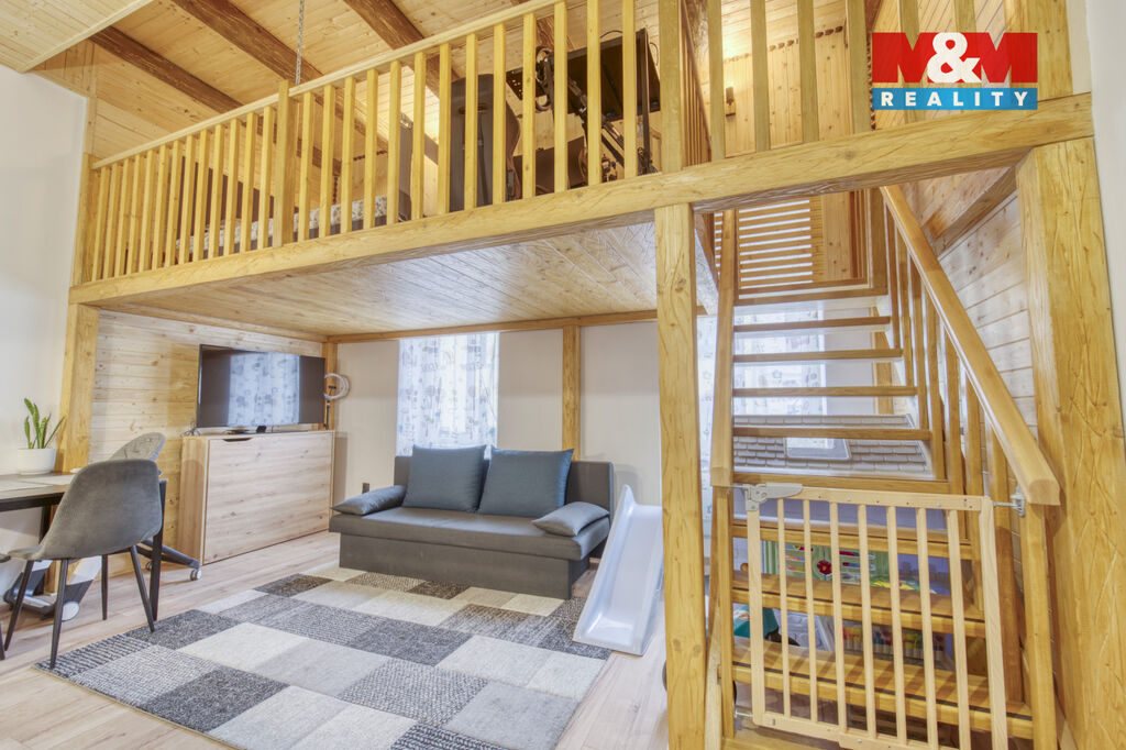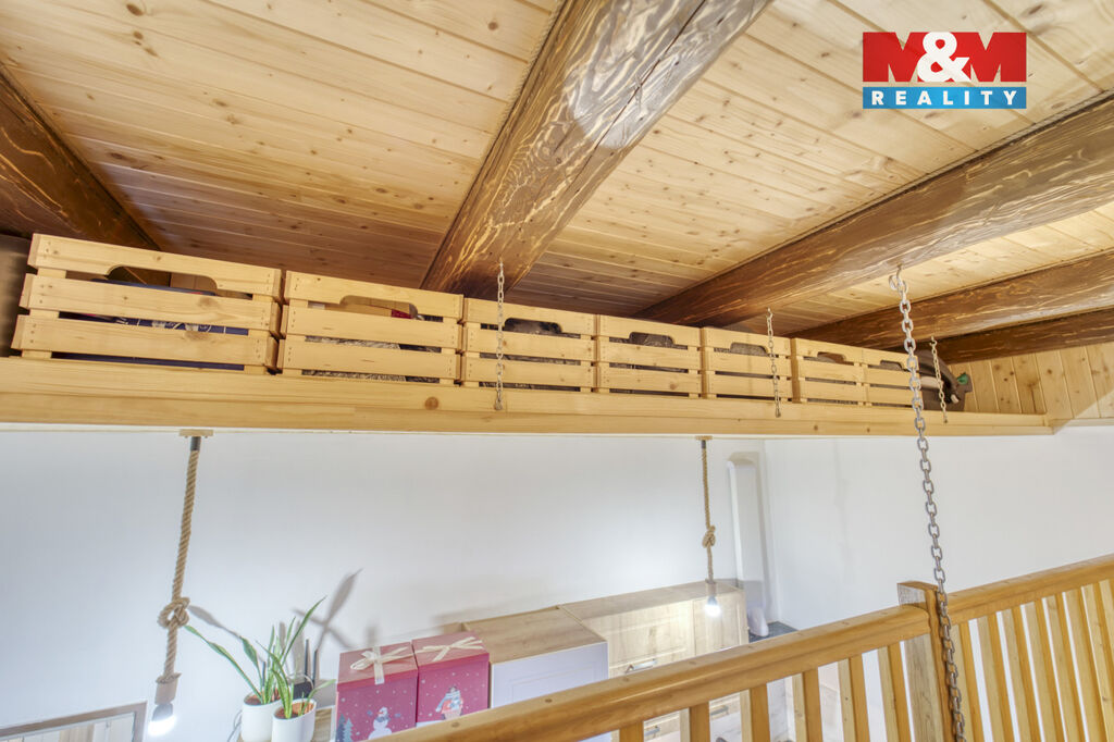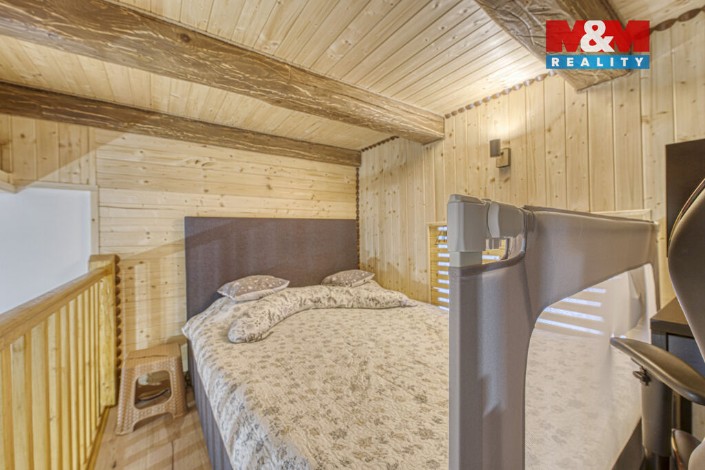 Nad obývací částí se nachází praktické patro na spaní s dostatkem místa pro manželskou postel i pracovní zónu.