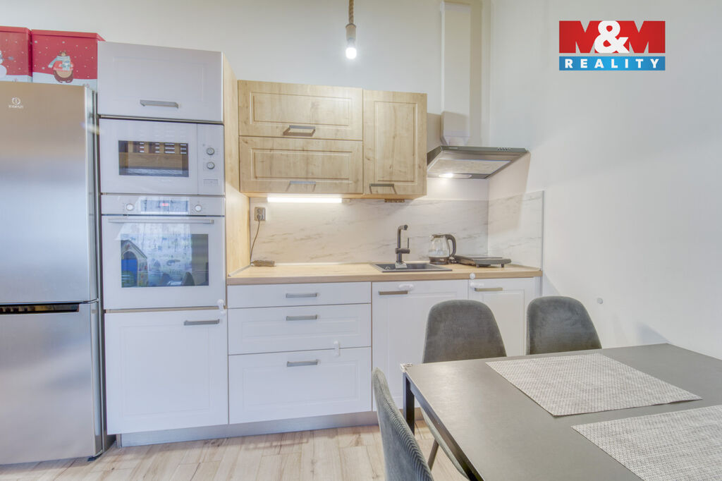 Interiér bytu prošel rekonstrukcí a je laděn v příjemném přírodním stylu s dřevěnými prvky.
