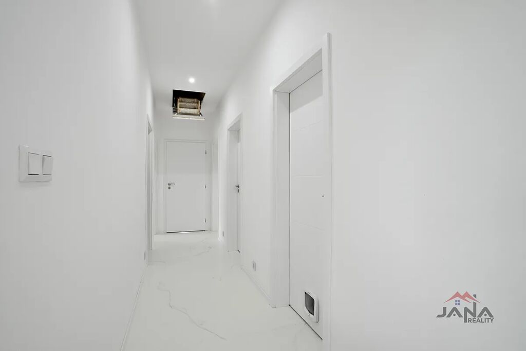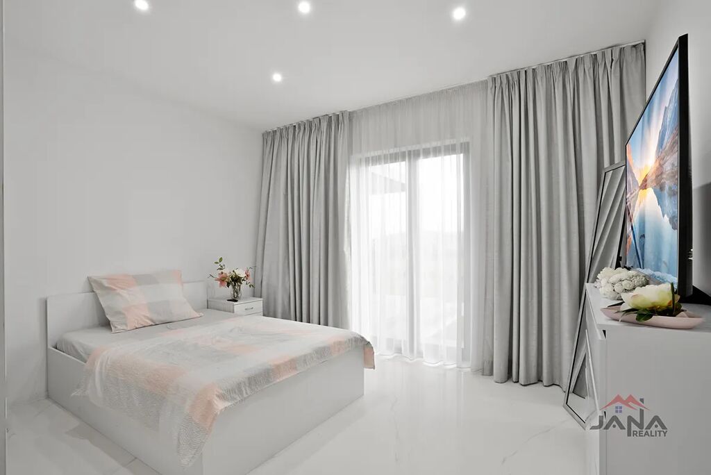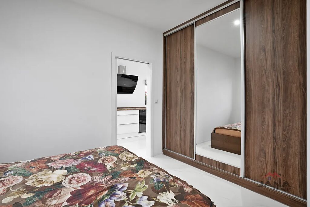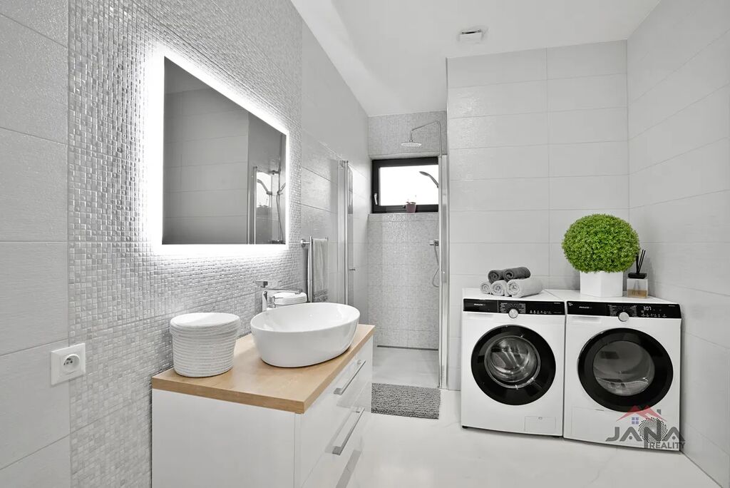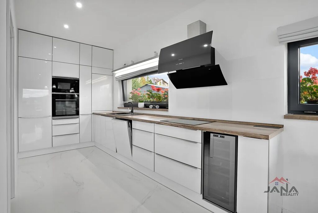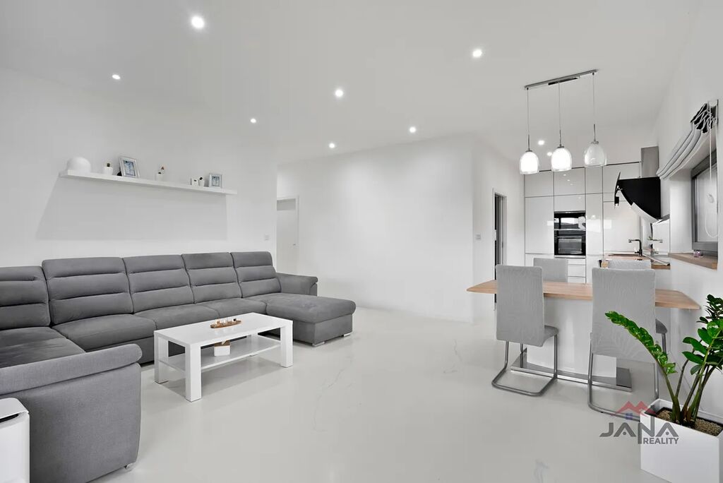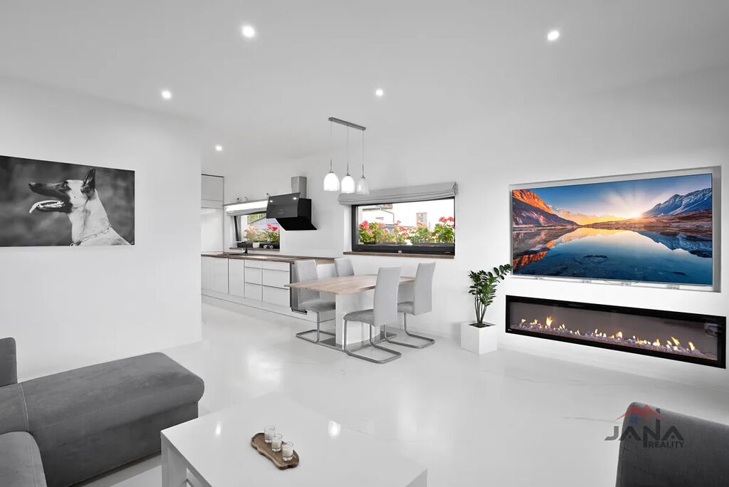 Dům je postaven s důrazem na nízké provozní náklady a maximální komfort. Efektivní vytápění zajišťuje tepelné čerpadlo v kombinaci s podlahovým topením, které zároveň zajišťuje ohřev TUV. Pro ještě větší úspory je systém doplněn solárními kolektory na ohřev TUV. V celém domě jsou plastová okna s trojskly, podlahy z lité epoxidové pryskyřice s mramorovým dekorem a strop je osazen bodovým LED osvětlením. Obývacímu pokoji dominuje pět metrů široký posuvný portál HS (polovina otevíratelná), který plynule propojuje interiér s terasou a zahradou. Moderní kuchyňská linka v bílém vysokém lesku je vybavena vestavěnými spotřebiči značky Philco – troubou, indukční deskou, mikrovlnnou troubou, lednicí, myčkou a vinotékou. Pracovní deska i parapety jsou v dekoru Dub Hunton. Obývací pokoj je vybaven vestavěnou TV a elektrickým krbem, které jsou součástí prodeje.