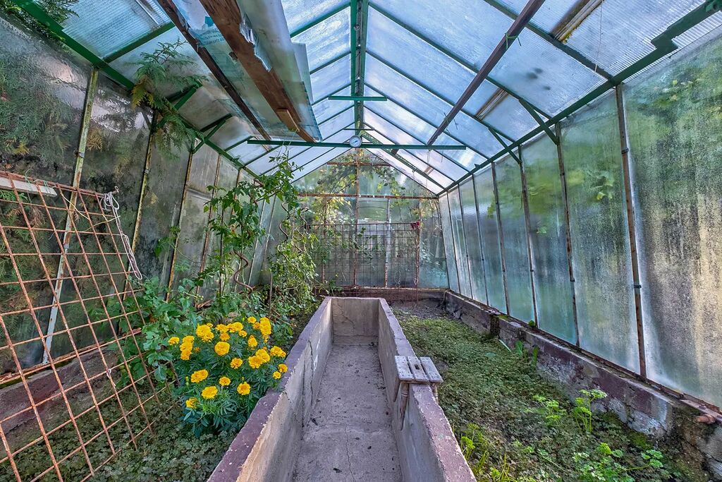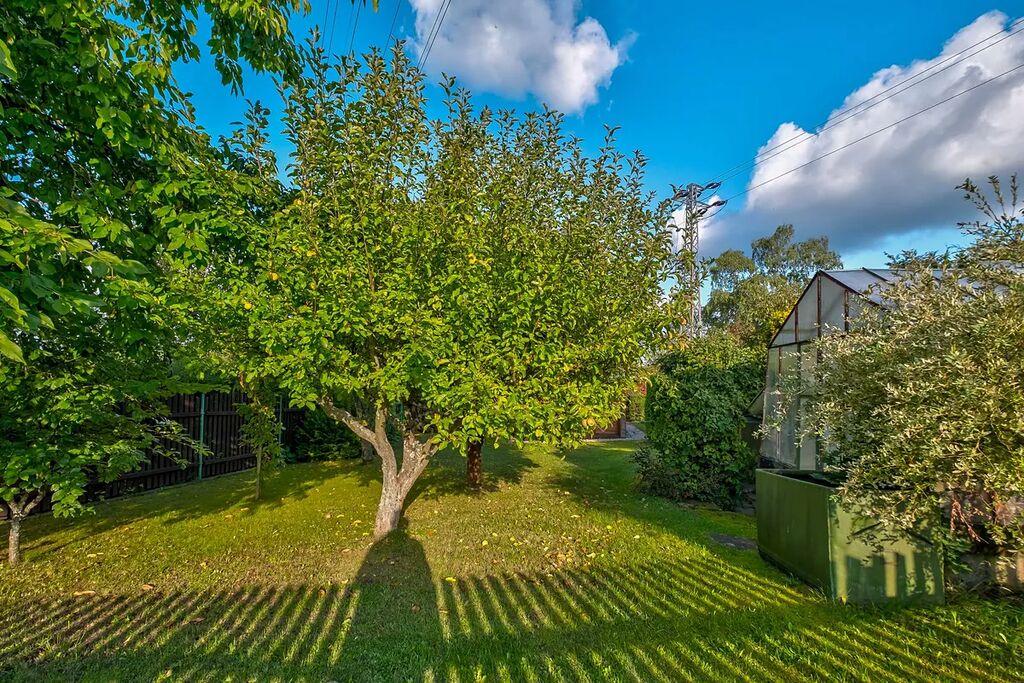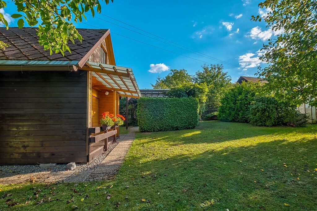 Zahrada je osázena vzrostlými ovocnými stromy a ořešákem. Jsou zde vybudovány záhony pro pěstování zeleniny a k dispozici je také skleník. Dešťová voda na zalévání je zadržovaná v akumulačních nádržích. K posezení slouží zastřešená pergola.