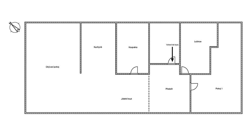 Byt má samostatný vstup do patra, který zajišťuje klid a soukromí. Dominantou je prostorná předsíň, ze které vedou vstupy do jednotlivých místností – pokoje, ložnice, velké koupelny s WC a především do rozsáhlé obytné místnosti, která propojuje obývací pokoj, kuchyni a jídelnu. Celý prostor působí vzdušně a příjemně díky velkým rozměrům a světlosti.