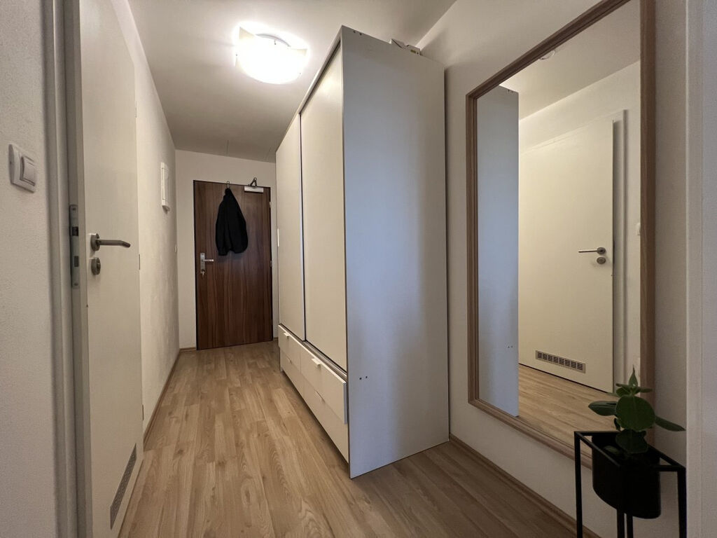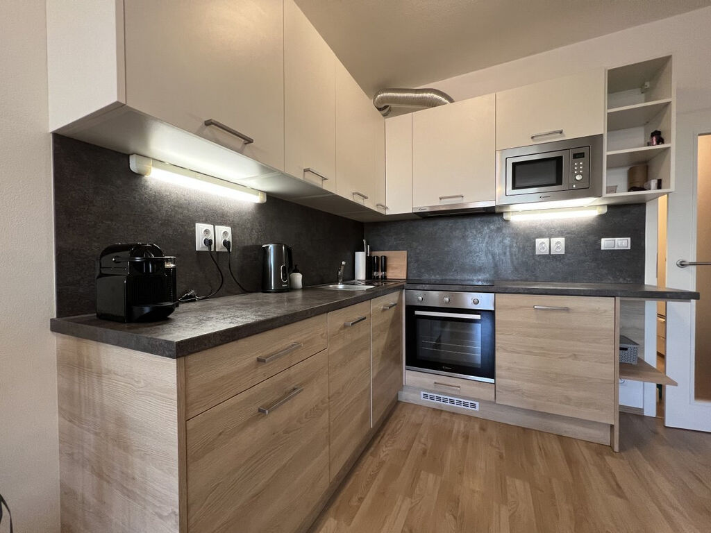 Byt se nabízí částečně nevybavený. Kuchyně disponuje lednicí, myčkou, elektrickou troubou, varnou deskou, mikrovlnnou troubou a digestoří. Obývací část je nezařízena. V koupelně je vana, umyvadlo a toaleta.