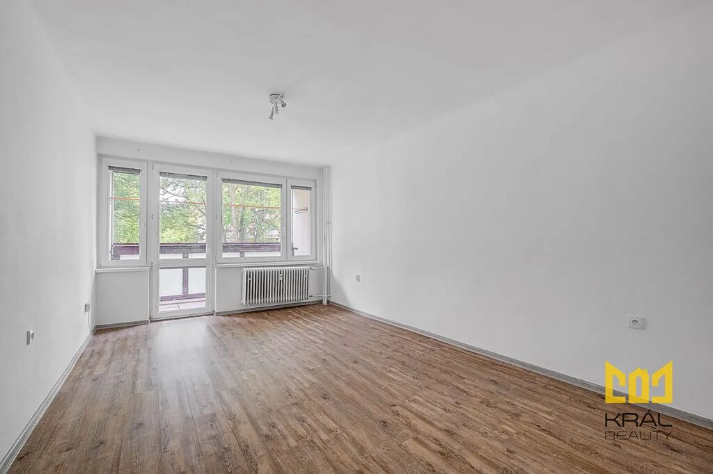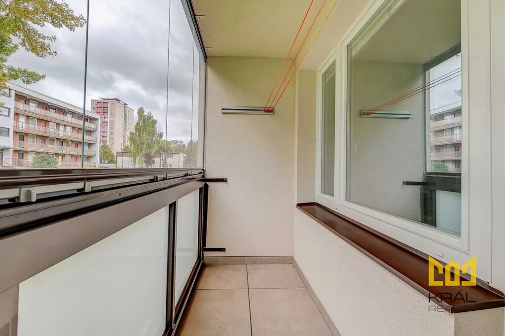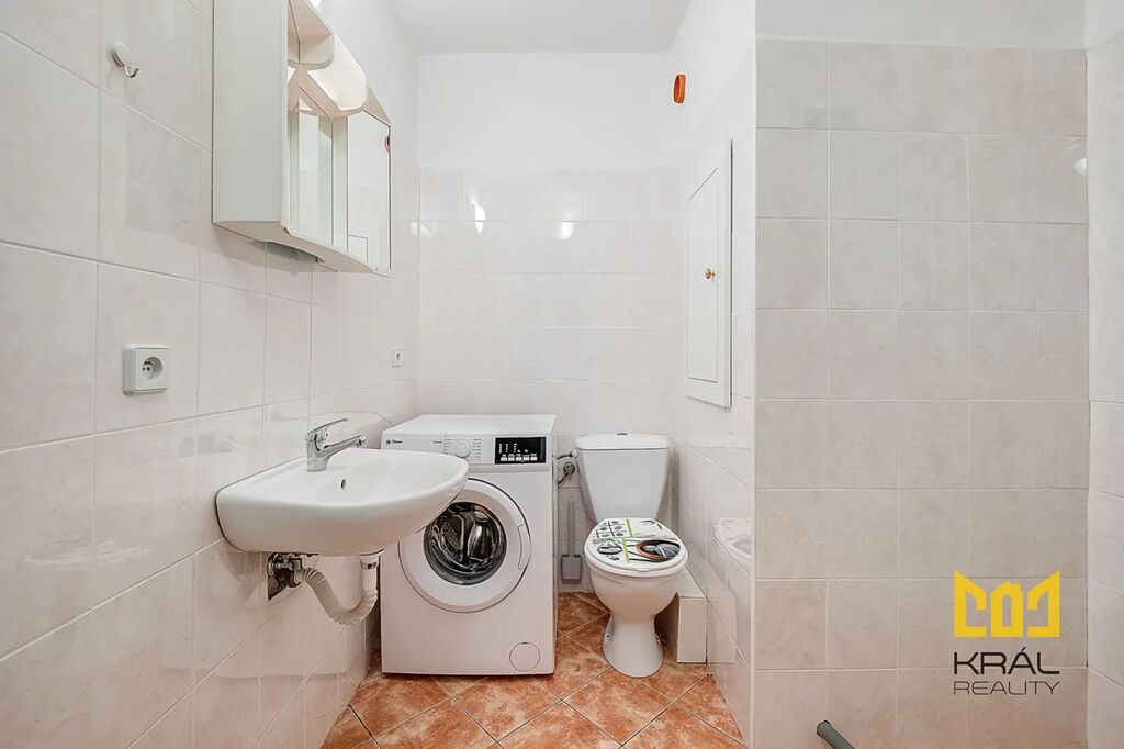 V koupelně se nachází sprchový kout, toaleta, umyvadlo a pračka. K dispozici je také komora a prostorný pokoj s výstupem na zasklenou lodžii. Díky vhodné orientaci je byt světlý a působí vzdušným a příjemným dojmem.