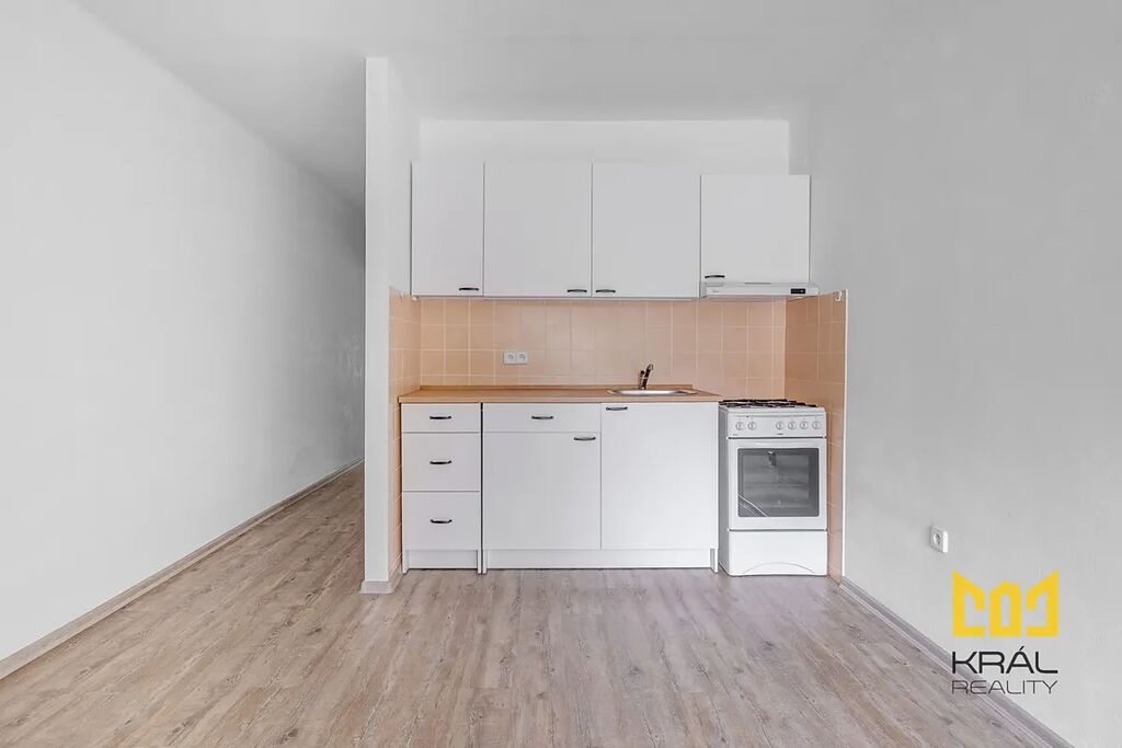 Dispozici bytu tvoří vstupní chodba s úložným prostorem, kuchyň s dostatkem místa pro vytvoření menšího obývacího koutu nebo jídelního stolu. Kuchyňská linka je sektorová, vybavená základními spotřebiči – kombinovaný sporák a digestoř.