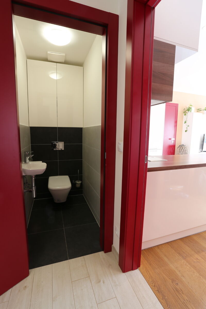 • červeně lakované bezfalcové dveře italské značky Ferrero Legno s magnetickými zámky