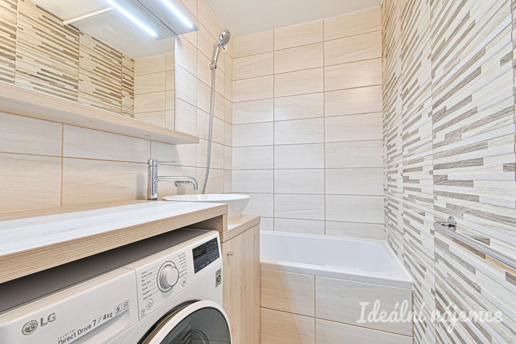 Koupelna je vybavena menší vanou, umyvadlem se skříňkou a pračkou. Toaleta je oddělená.