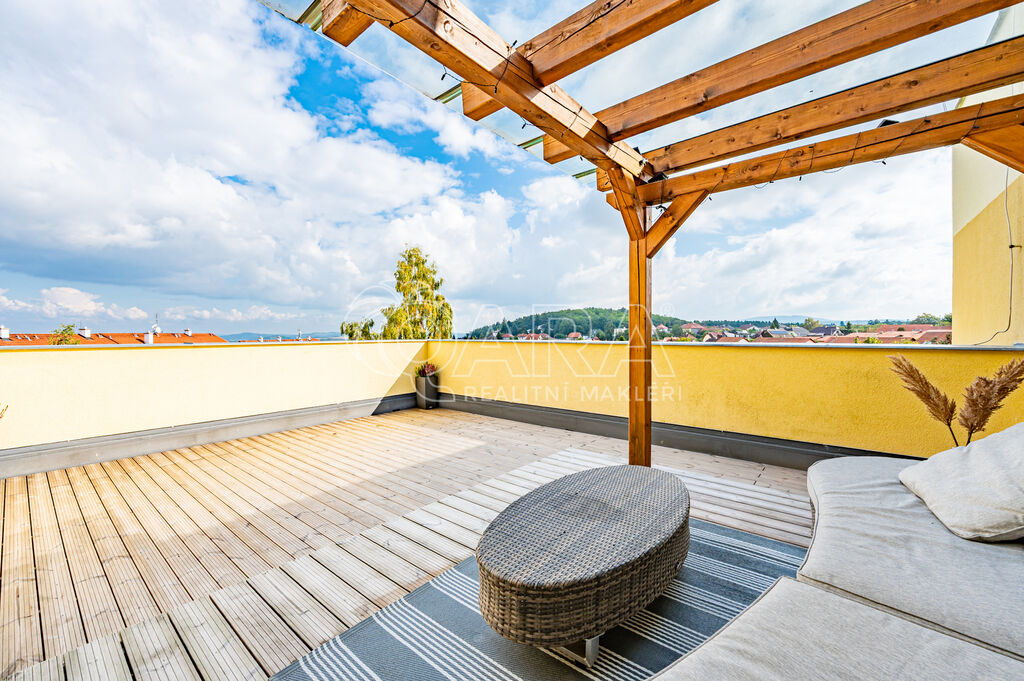 Skvělým bonusem je prostorná terasa s výměrou 37 m² a výhledem na lesopark Dražovka. Povrch tvoří masivní Thermoborovice, nechybí ani pergola se zastřešením z tvrzeného skla, ideální pro relax nebo večerní posezení.