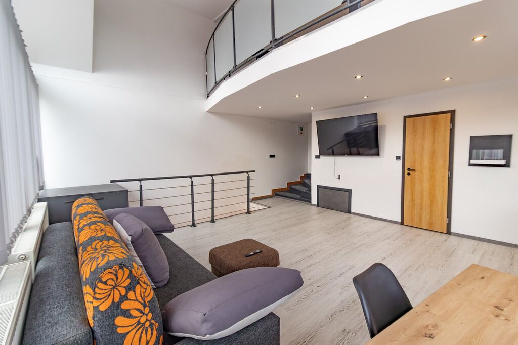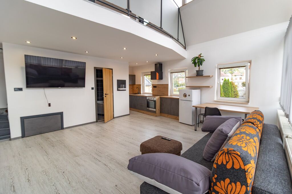 Nabízíme k pronájmu nadstandardní mezonetový byt v moderním vkusném stylu o dispozici 2+kk ve zděném domě v 1. - 2. patře v centru města Sušice. Tento byt s celkovou obytnou plochou 60 m2 vyniká právě svou volností a lehkostí v příjemném nadstandardu, zrovna tak je vybaven novější kuchyní na míru a podlahovými krytinami. Vnitřní dispozice: po schodech v I.patře o výměře 35m2: vzdušný pokoj s TV, menší sedačkou, pracovním stolem, novou kuchyní (el. sporák se sklokeramickou deskou, myčkou, chladničkou), koupelna s pračkou, vanou, WC a předsíňový meziprostor. V podkroví o výměře 25m2: pokoj / ložnice s úložným prostorem. Tento byt současně nabízí příjemný výhled na nábřeží s řekou a vrchol Anděla Strážného. Součástí nájmu lze využívat parkovacího stání ve dvoře domu. Vytápění ústředním topením el. kotlem s vlastním elektoměřičem. Platby spojené s užíváním bytu: nájem 14.500,-Kč/měs. (včetně vody) + zálohy na el. energii. Volné od 1.11.2025.
