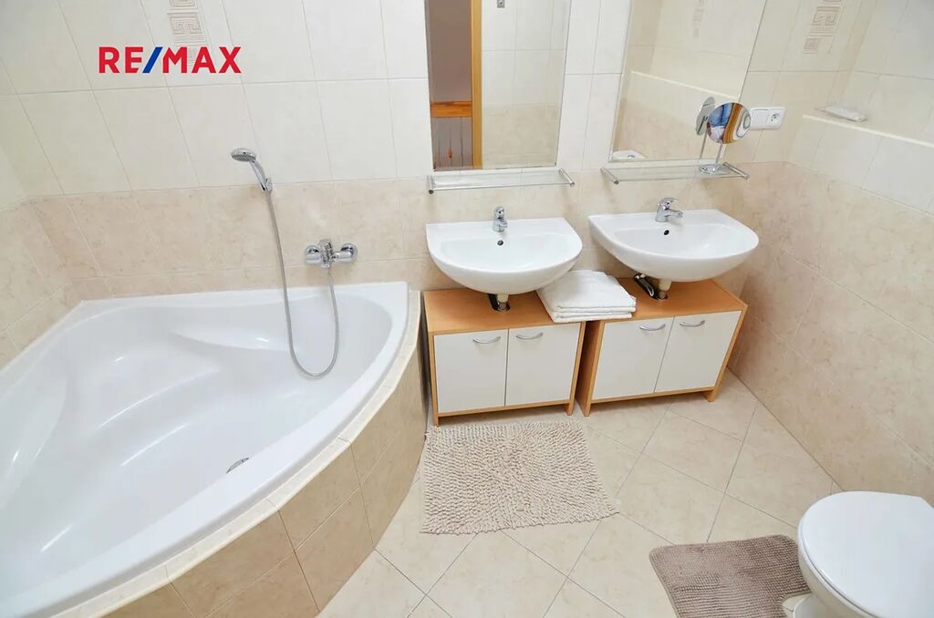 V prvním poschodí domu dvě samostatné ložnice a samozřejmostí je též koupelna se dvěma umyvadly, vanou a WC. Parkování možné na pozemku u domu.