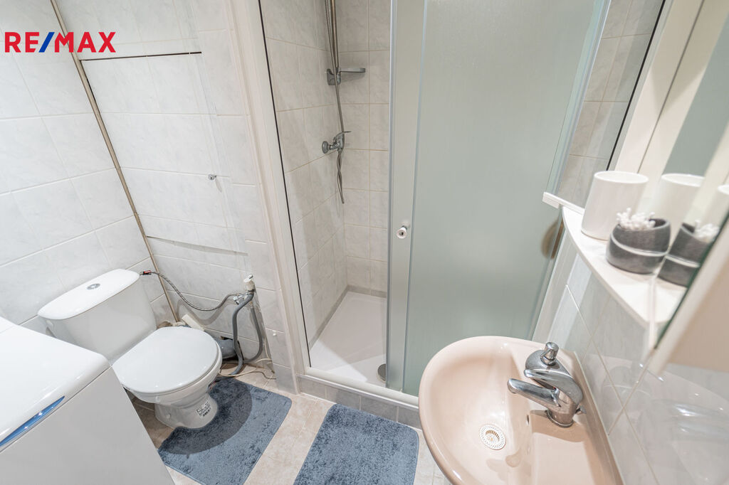 Koupelna s novým sprchovým koutem, koupelnovým nábytkem a pračkou.