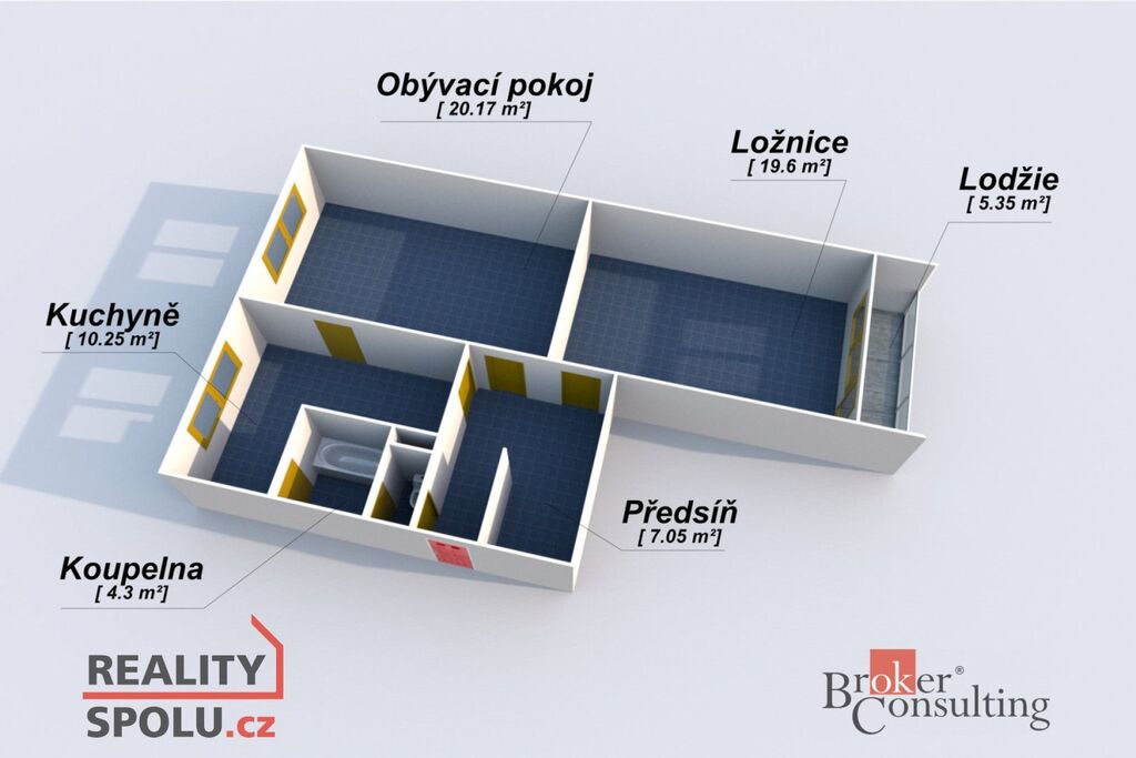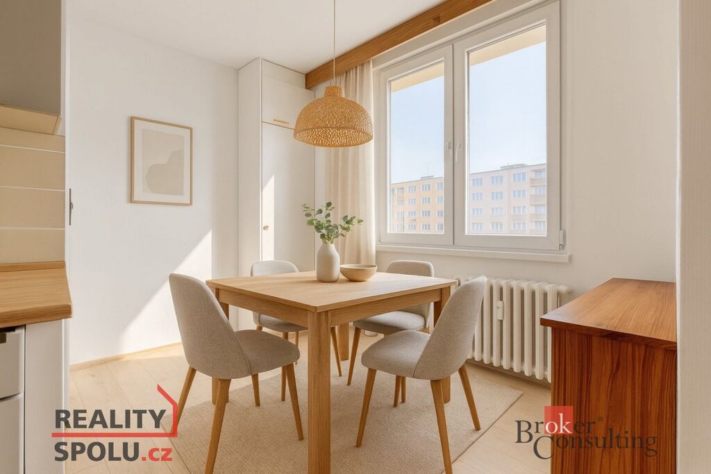 Dispozice nabízí dvě místnosti, kuchyň, koupelnu a toaletu. K bytu náleží také sklepní kóje.