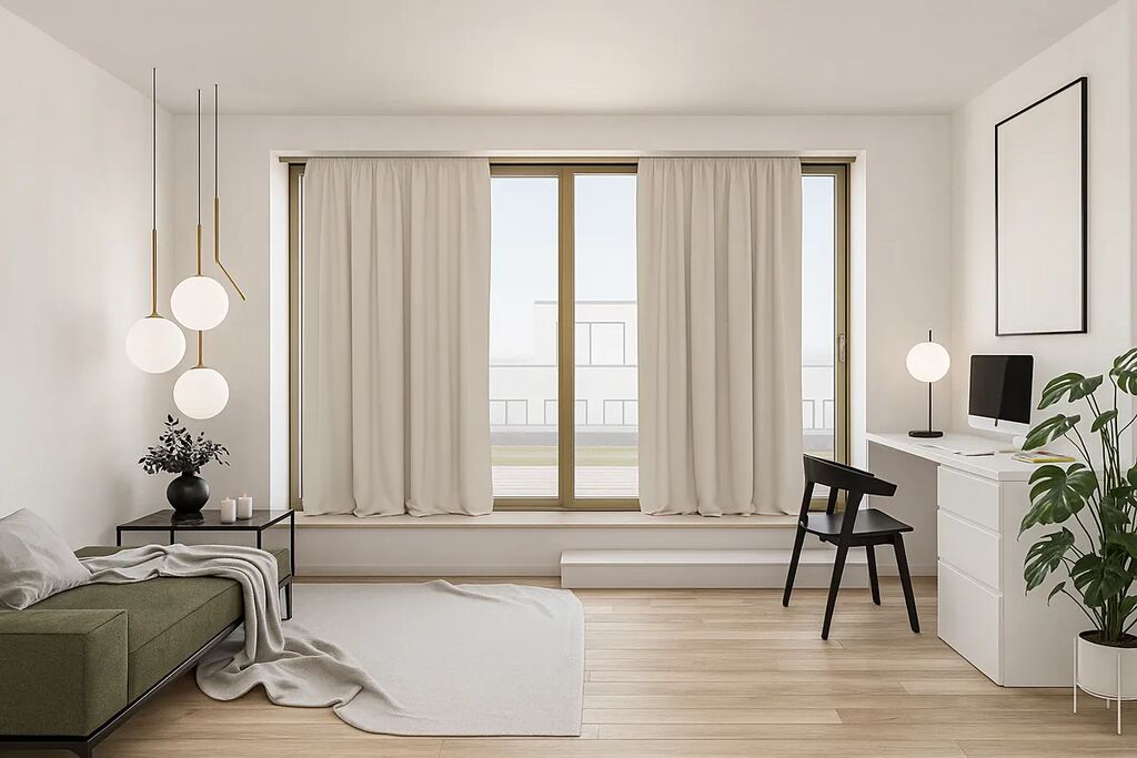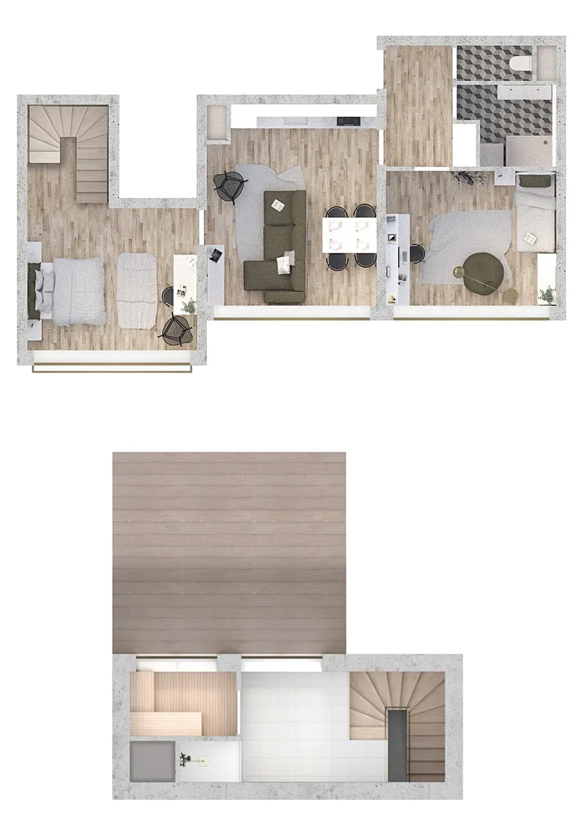 Na předsíň navazuje pokoj orientovaný na západ, ideální například jako dětský pokoj nebo pracovna. Hlavní obytný prostor tvoří světlý obývací pokoj s přípravou pro kuchyňskou linku a místem pro jídelní stůl. Na obývací pokoj navazuje další místnost s velkým panoramatickým oknem se sníženým parapetem, ze které dále vede schodiště do střešního patra s vlastní koupelnou a pokojem, ze kterého se vstupuje na střešní terasu. Ta nabízí naprosté soukromí a jedinečné výhledy.