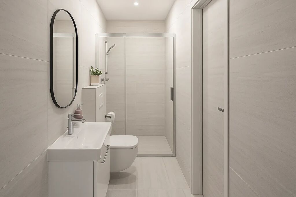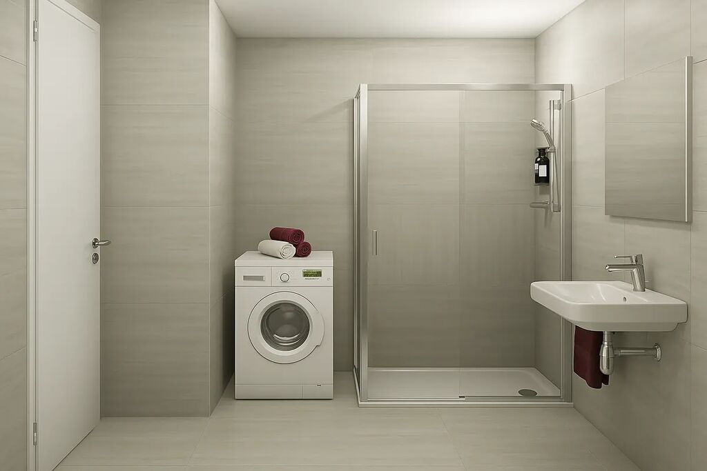 Po vstupu do bytu vás přivítá prostorná vstupní hala se zádveřím a úložnými prostory. Odtud je přístup do koupelny s prodlouženým sprchovým koutem a umyvadlem, wc je samostatné.
