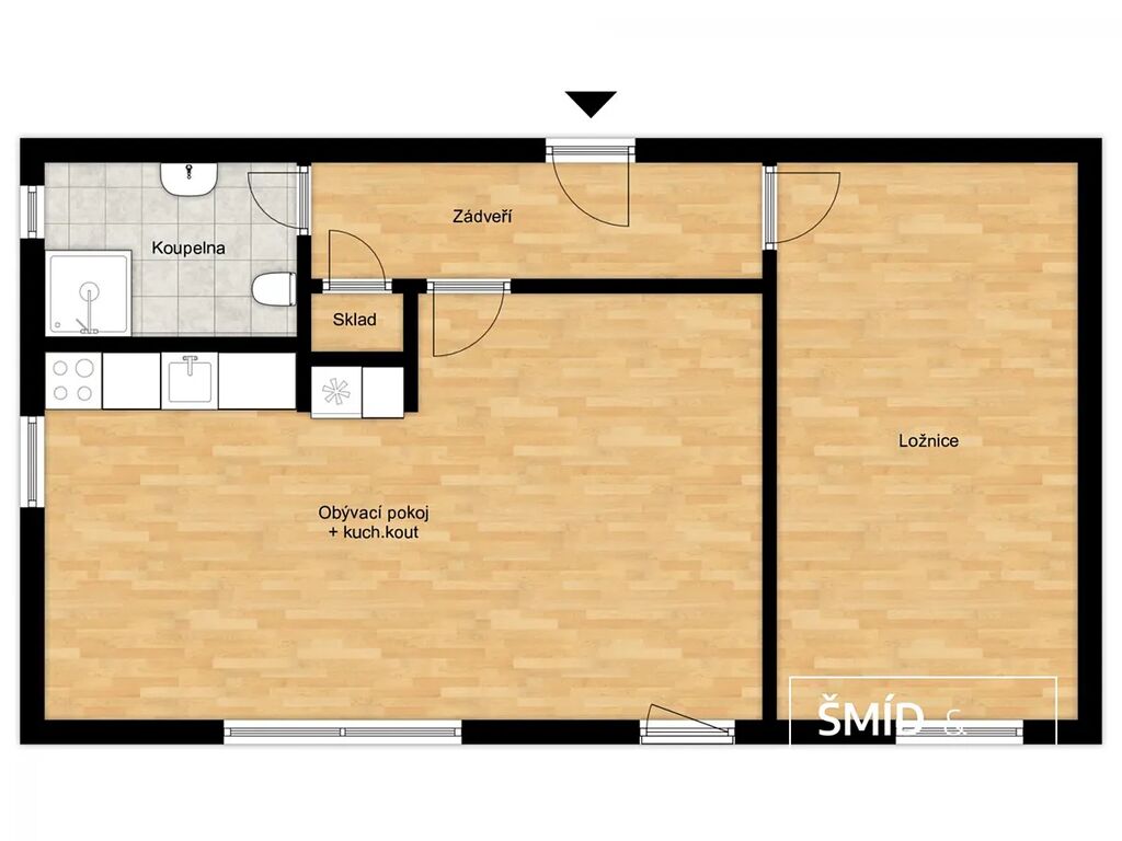 barvě s dekorem dubu a vestavěnými spotřebiči. Podlahy kombinují praktickou keramickou