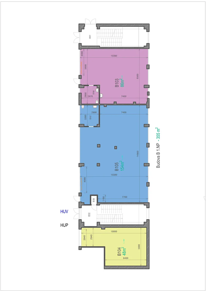 Pronájem nebytových prostor B104 ve 1.NP budovy B o rozměrech 10x6m respektive 6x6 o podlahové ploše 48m2 s výškou stropu ve vjezdu 3,3m vhodné jako dílna, sklad, výrobna, apod…