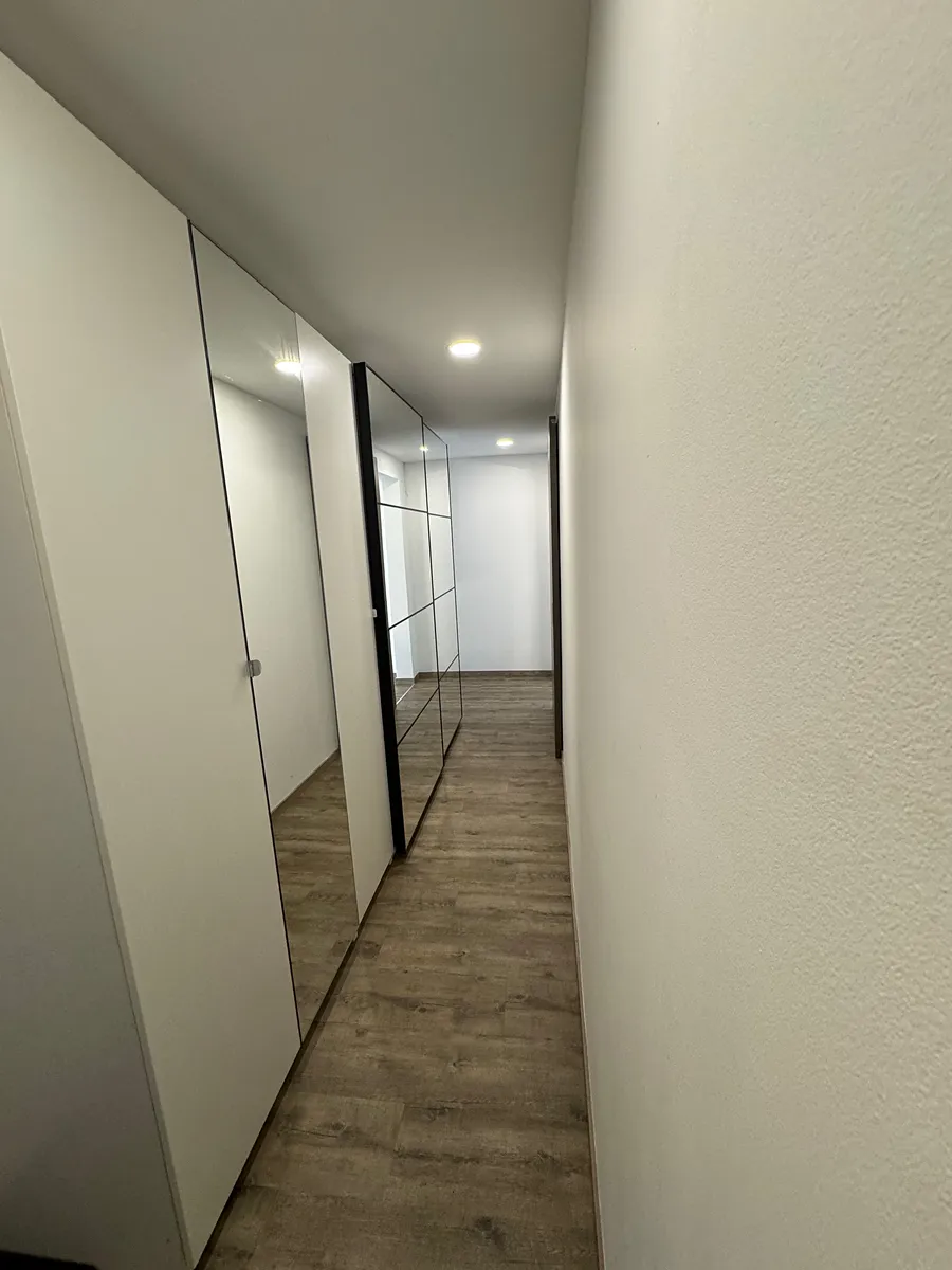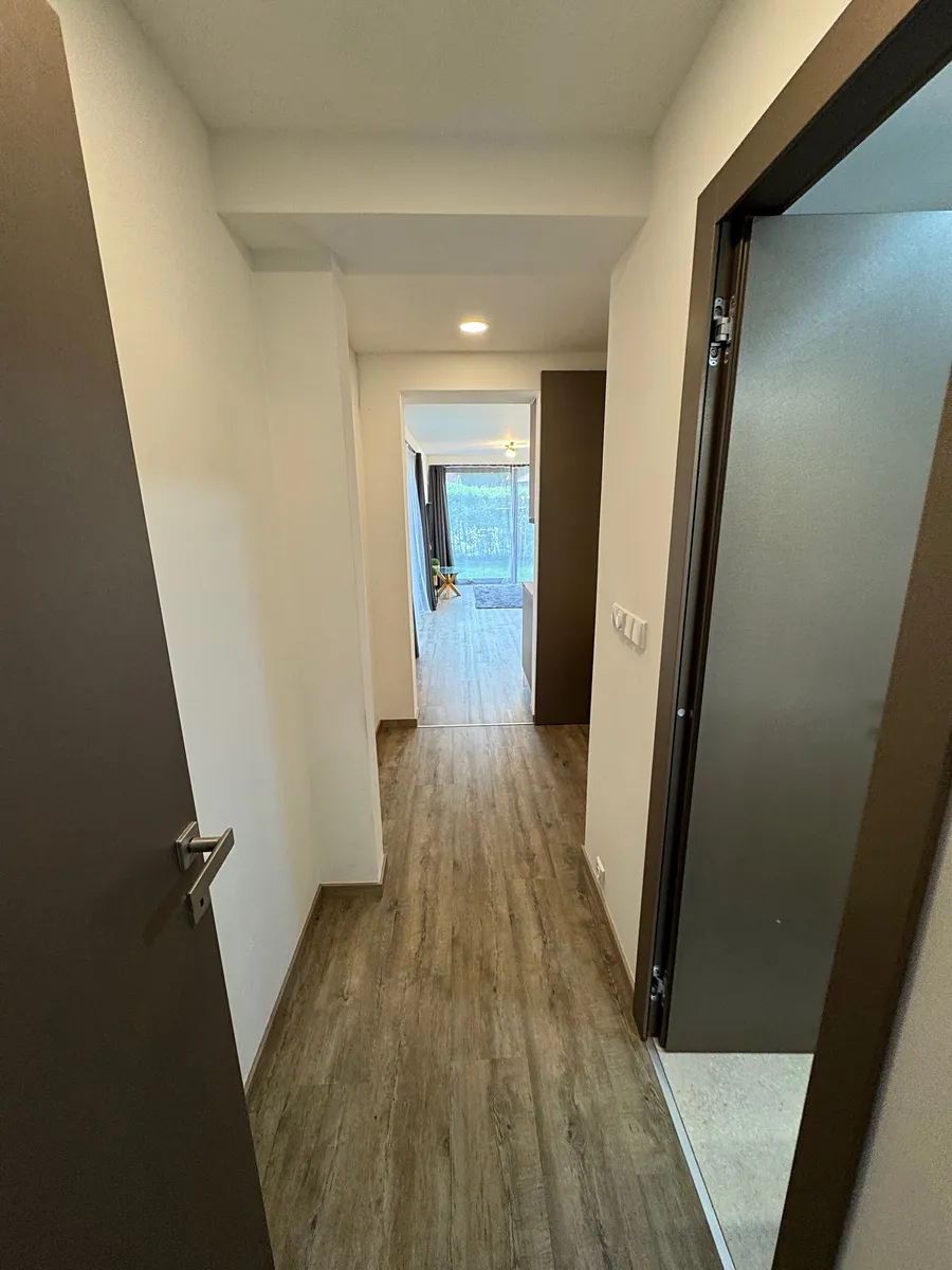 Samotný byt je pojat vcelku velkoryse a přitom velmi prakticky. Součástí vstupní chodby je obří vestavěná skříň kam se vejde vše. Západně orientovaná ložnice s palandou stejně jako koupelna a WC jsou chodbou odděleny od obývacího pokoje a kuchyně, takže část osazenstva může klidně spát, zatímco zbytek si užívá v obýváku. Obývací pokoj je orientován na severovýchod a stejně jako v ložnici jsou jeho obvodové venkovní stěny prosklené pomocí obřích posuvných dveří. Vše je velice kvalitní a perfektně funkční. V celém bytě je kvalitní vinylová podlaha a úsporné podlahové vytápění, které je dálkově ovládané.